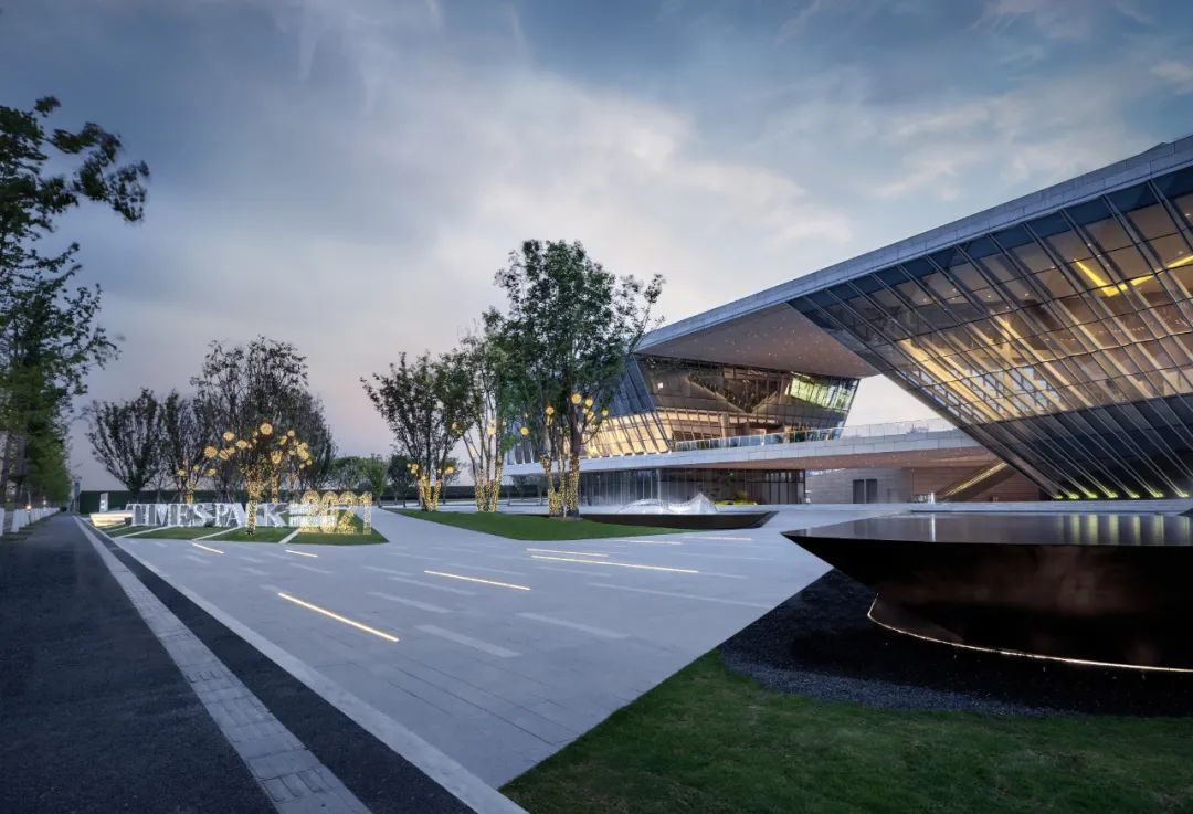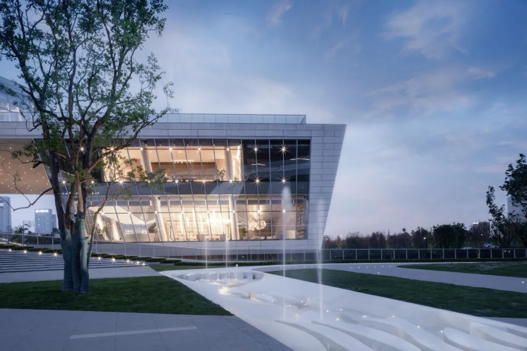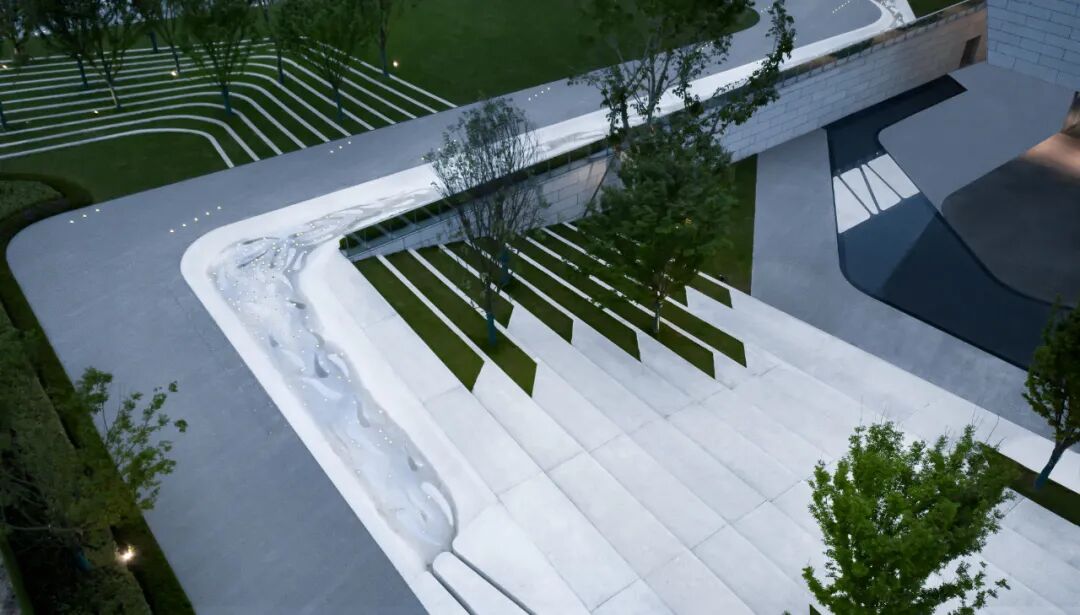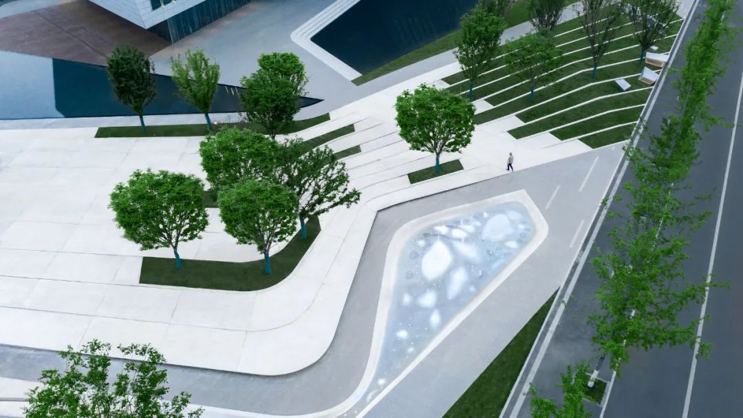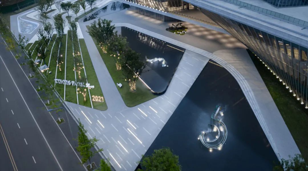 ▼流转的“溪水”是贯穿整个场地的活力元素,前场空间作为场地的展示界面,毗邻天府公园,是城市人流的汇集空间,也是“百川”的源头。我们将公园、建筑和场地进行整体考虑,设计上将他们进行整合与统一,通过转折的水景、地面铺装、关键点的标识雕塑、艺术灯光等,引导人流自然地进入场地。