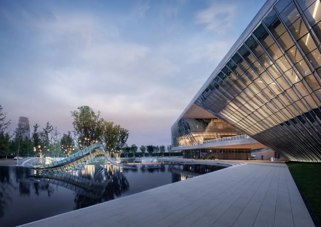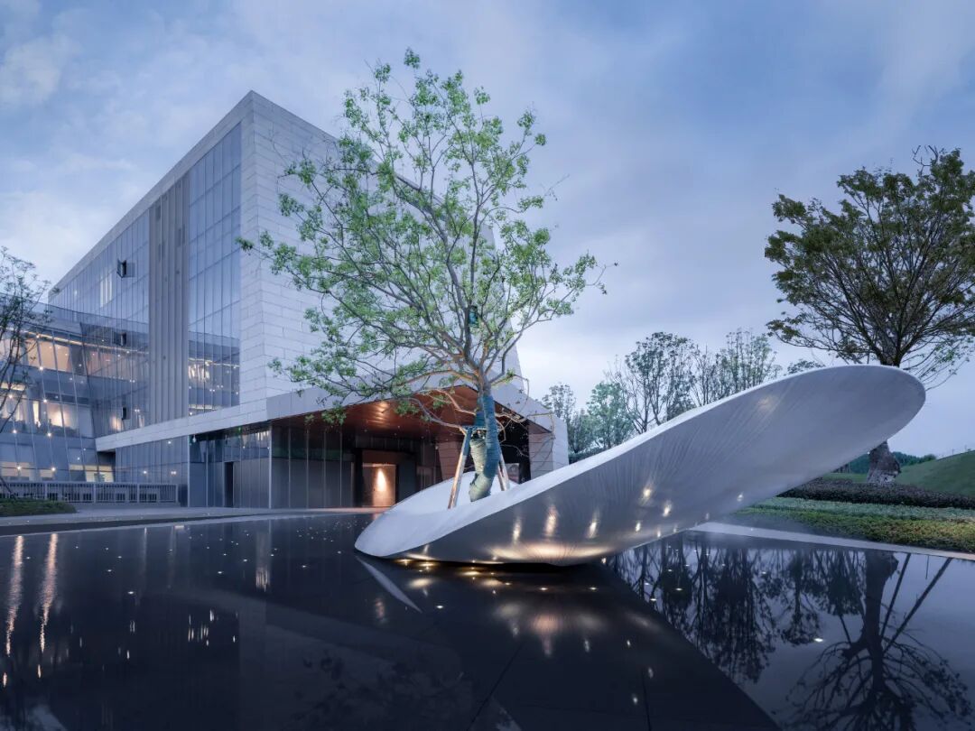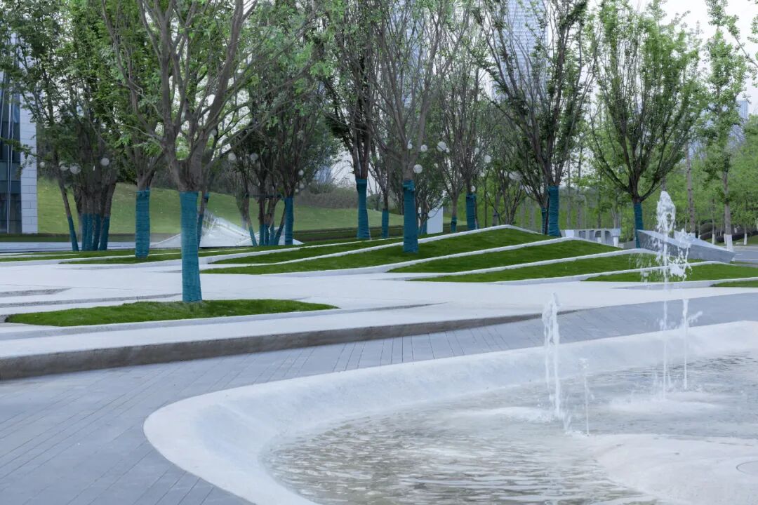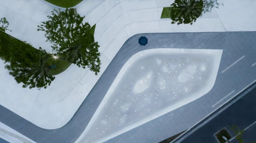▼流转的“溪水”是贯穿整个场地的活力元素,前场空间作为场地的展示界面,毗邻天府公园,是城市人流的汇集空间,也是“百川”的源头。我们将公园、建筑和场地进行整体考虑,设计上将他们进行整合与统一,通过转折的水景、地面铺装、关键点的标识雕塑、艺术灯光等,引导人流自然地进入场地。