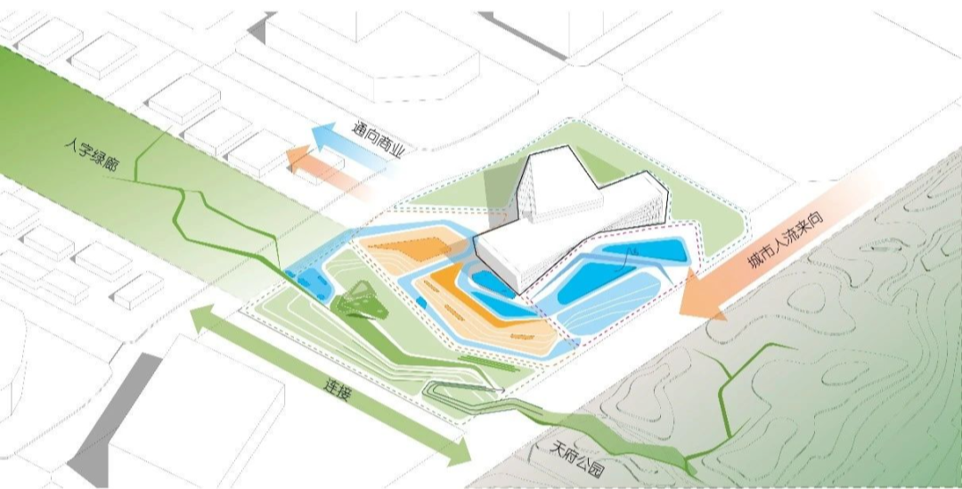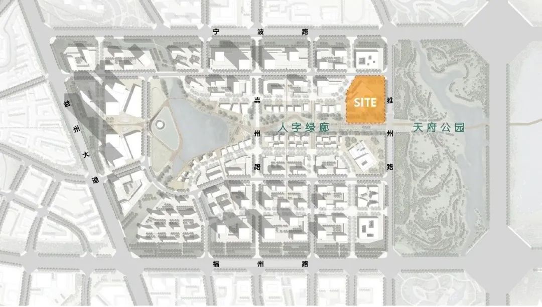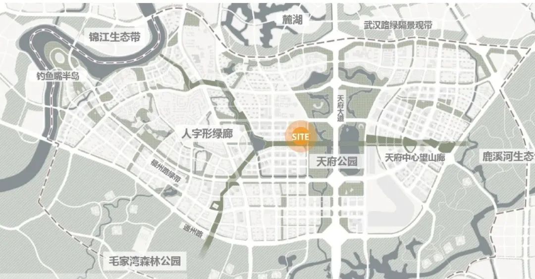 基地位于成都天府新区的中央商务区——处于天府大道轴线之上,与天府公园相邻。未来这里将成为成都市的新中心,整体区域涵盖住宅、商业、公寓、办公四大复合业态,当中的生态绿廊更是串联整个区域的“绿色呼吸系统”。当然,飞速的现代化进程带来了产业配套的极大增加,也带来了城市与自然的衔接、公共空间不足等问题。对于我们最大的挑战不是怎样设计一个空间,而是如何创造一个当地与外来人所认同的生态活力场景。