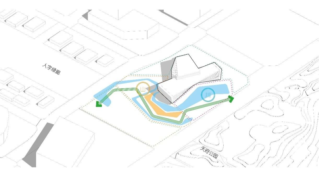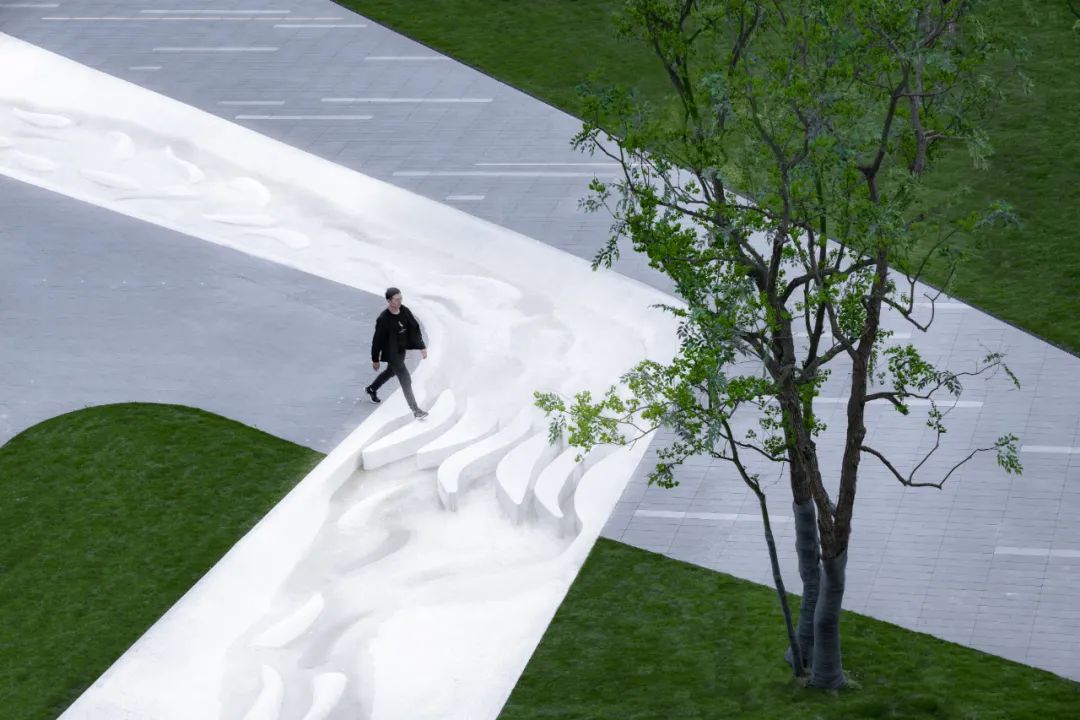 如今我们将这两条自然脉络延续与演化,重新赋予它们在场地与空间中新的意义,通过形态的走势与变化形成不同的空间感受,带来多样化的公共活力空间和艺术体验舞台。这座地标性的舞台,也是具有生命力量的生态舞台,代表着这座城市的活力与新生。