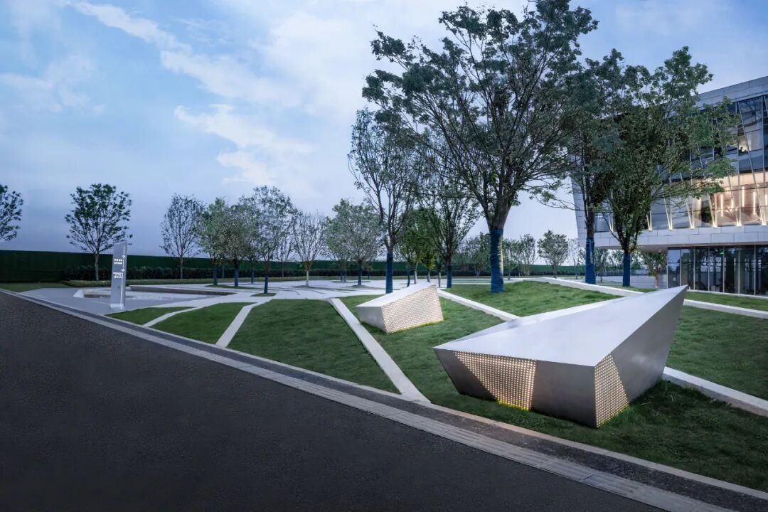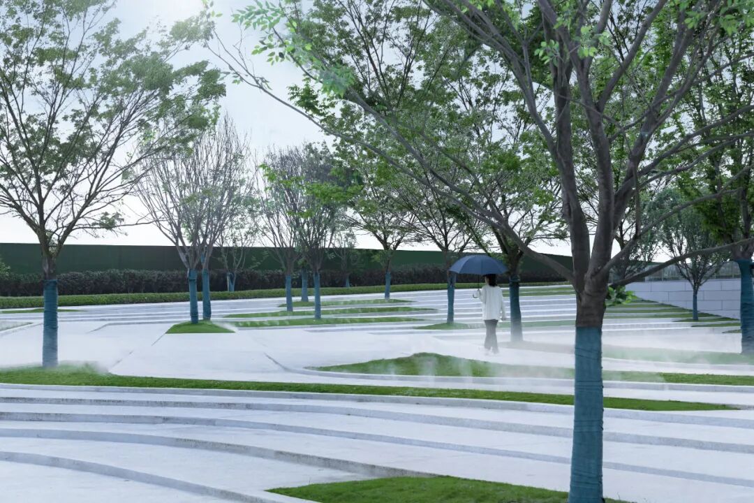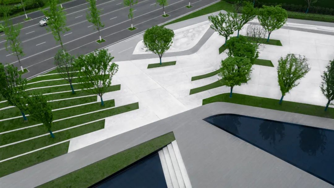 ▼线性的艺术草坡和林下步道,在为临街界面和场地空间创造关键视觉落差的同时,也为人们提供了遮荫的场所。除此之外还创造了从入口到南侧休闲空间的视觉联系,减弱建筑与空间的边界关系,并且加强了空间之间的边界连接。
