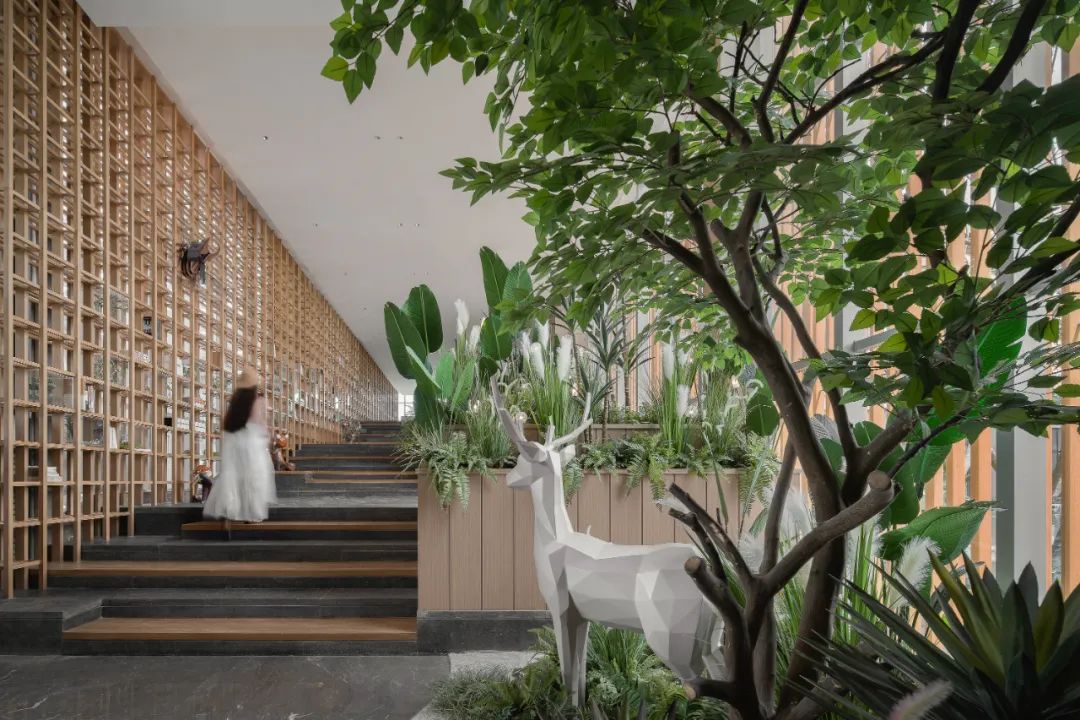 在内部空间的表达上,用高大的树木艺术品,创造视觉亮点,吸引人们走进、亲近该空间,消除高空的不确定感。