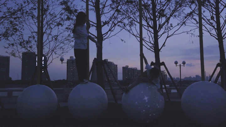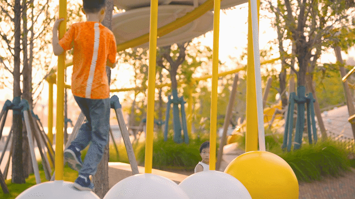 沿着设计的曲线转啊转,穿过野趣的爬网地带,攀爬网两侧黄白相间的风车将捕捉江风的动作向心转动,变成“风球”,让攀爬更增趣味。