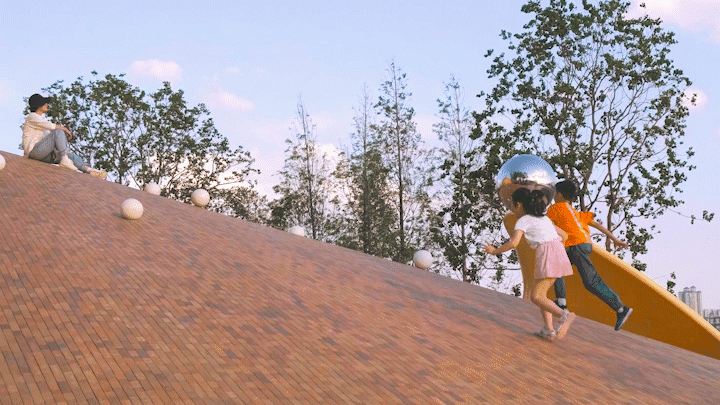 简单元素的堆砌带来特别的魅力,即使是红砖这样硬朗的材料,经过重复排列也有了柔美流畅的线条,有如珠江曼波。设计师因此决定利用红砖打造起伏地形的地景式乐园,既保留场地附近的工业记忆,也与珠江倾偈。