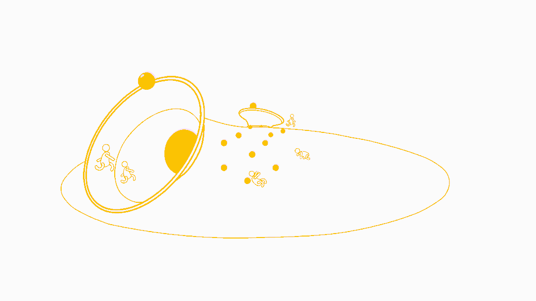 海宝乐园的海宝是一颗贪玩的球,有珍珠般的外表,它在巨大的弹弓上蓄势待发。黄色管道架设起海宝即将巡游的路径,其所到之处皆成为游乐场。