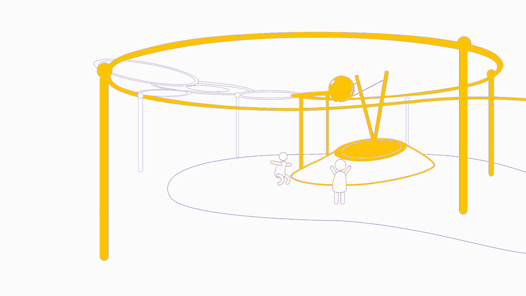 场地中间的大蹦床,人在其中蹦跳时,会产生同频共振触发隐藏的声音游戏——船只的汽笛声,这是设计师对珠江印象的一种记录。
