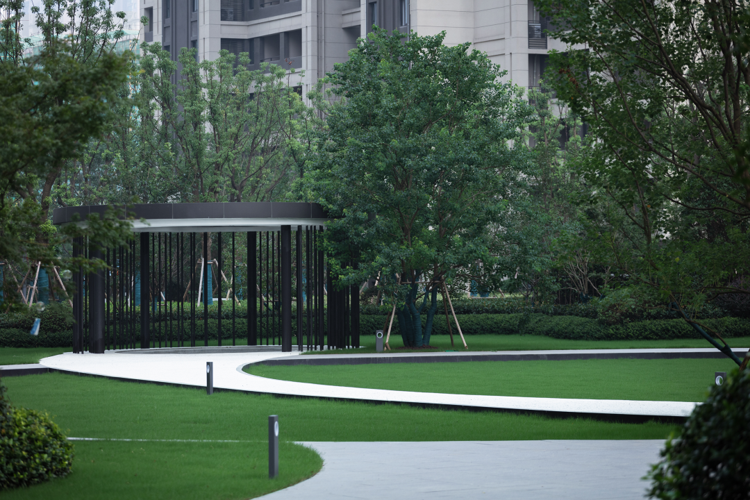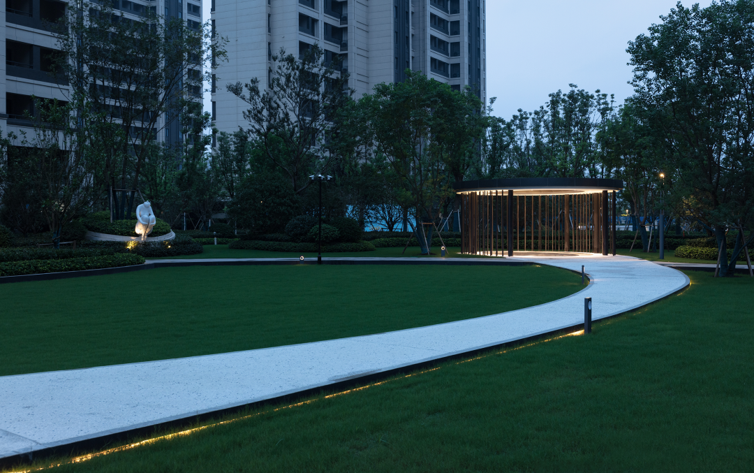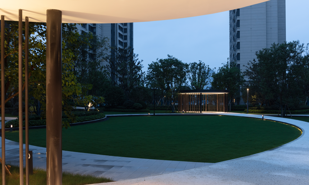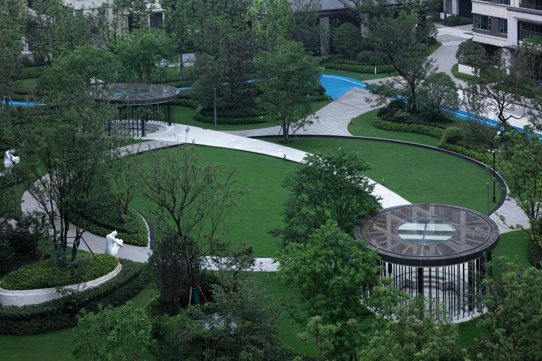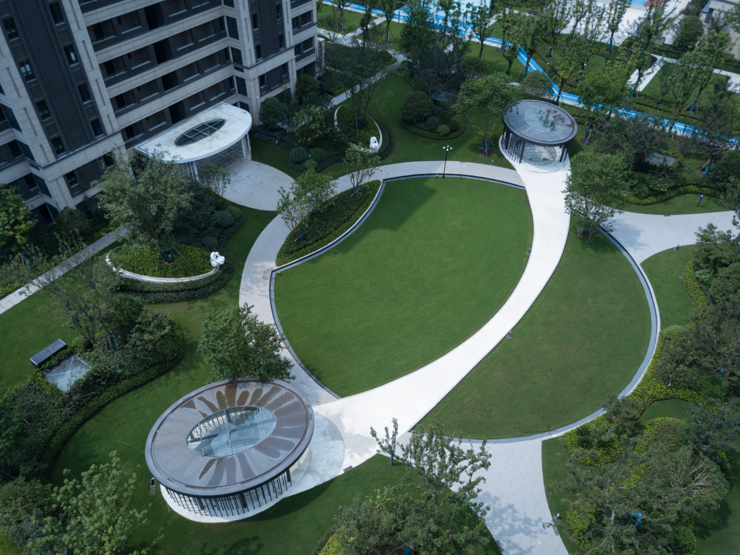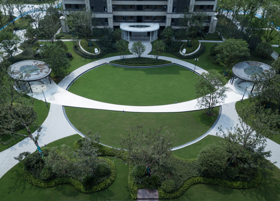景观以环绕绿色共享生活为社区会客厅的主旨。从几何上来解读,圆是一个聚焦性最强而周界力量最均值灵动的图形。聚绿而凝人,遇边而停留。