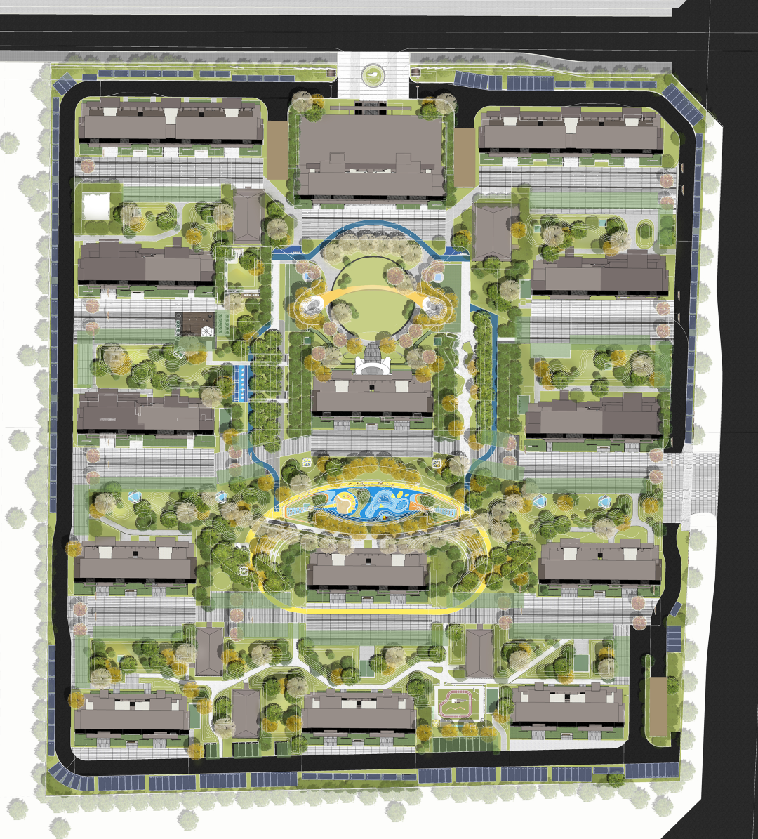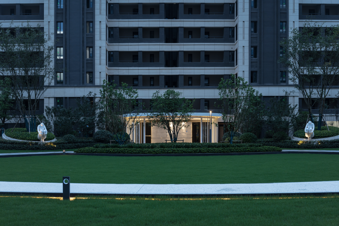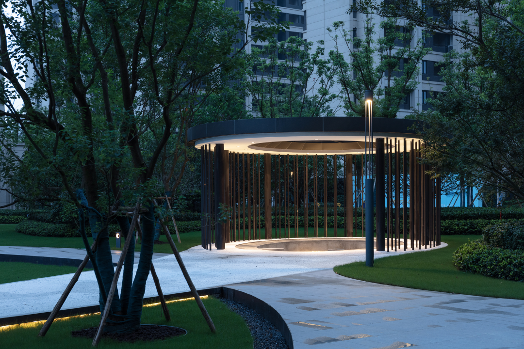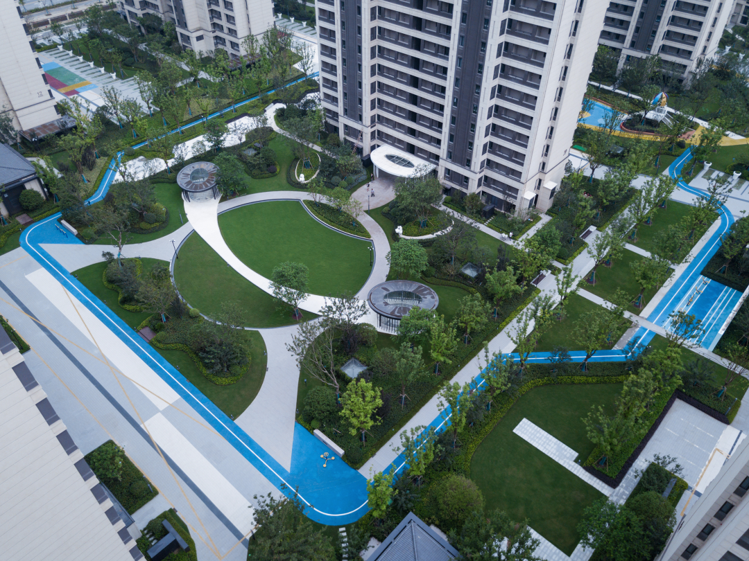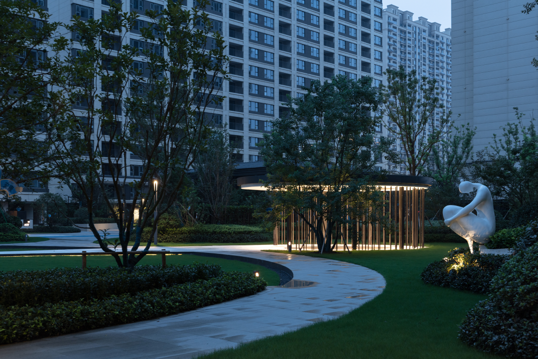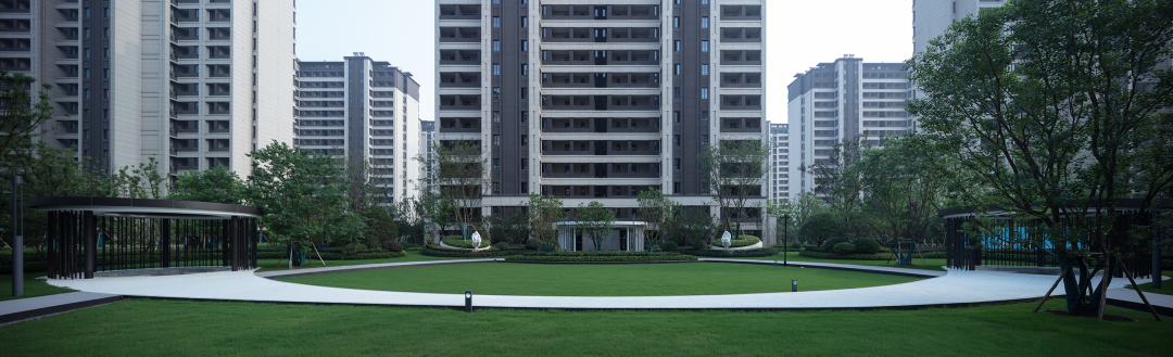 景观以环绕绿色共享生活为社区会客厅的主旨。从几何上来解读,圆是一个聚焦性最强而周界力量最均值灵动的图形。聚绿而凝人,遇边而停留。