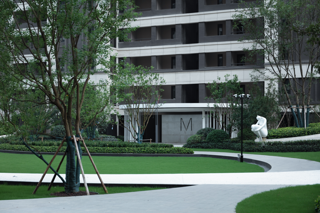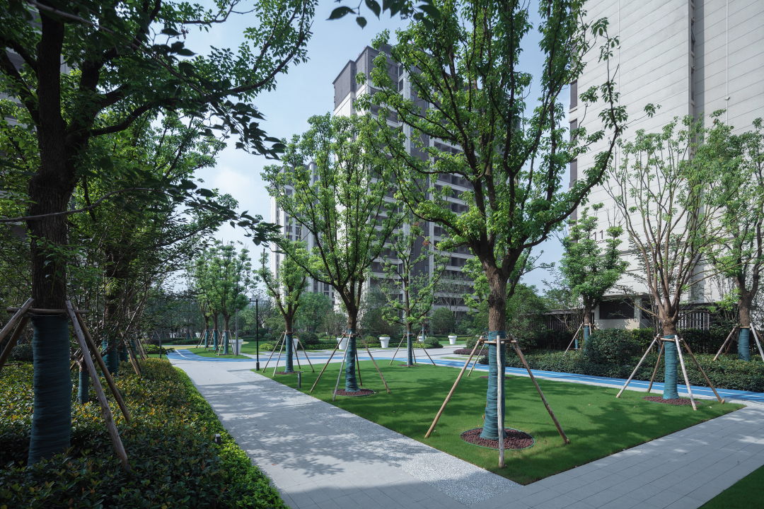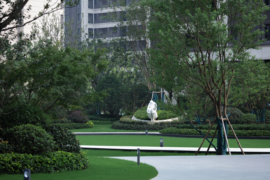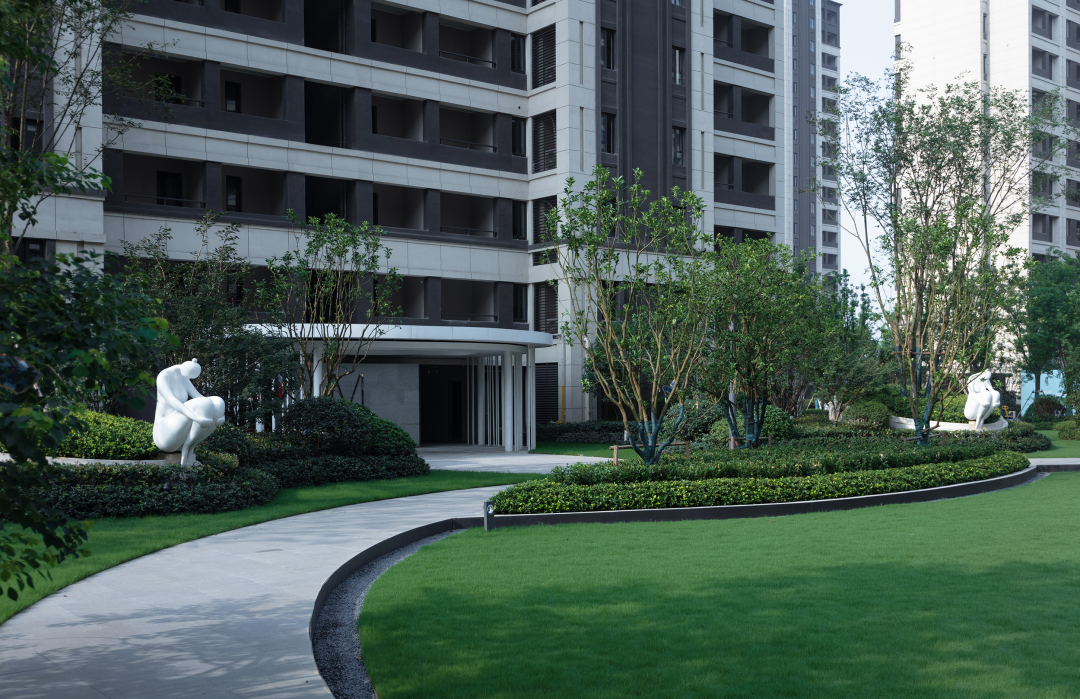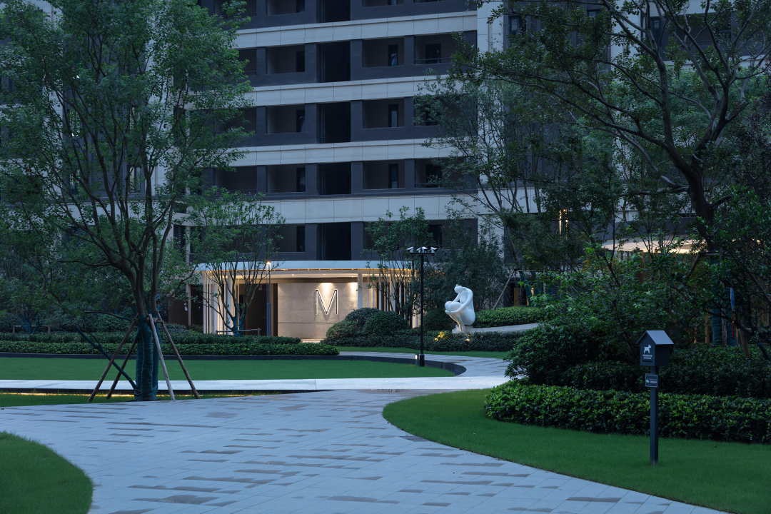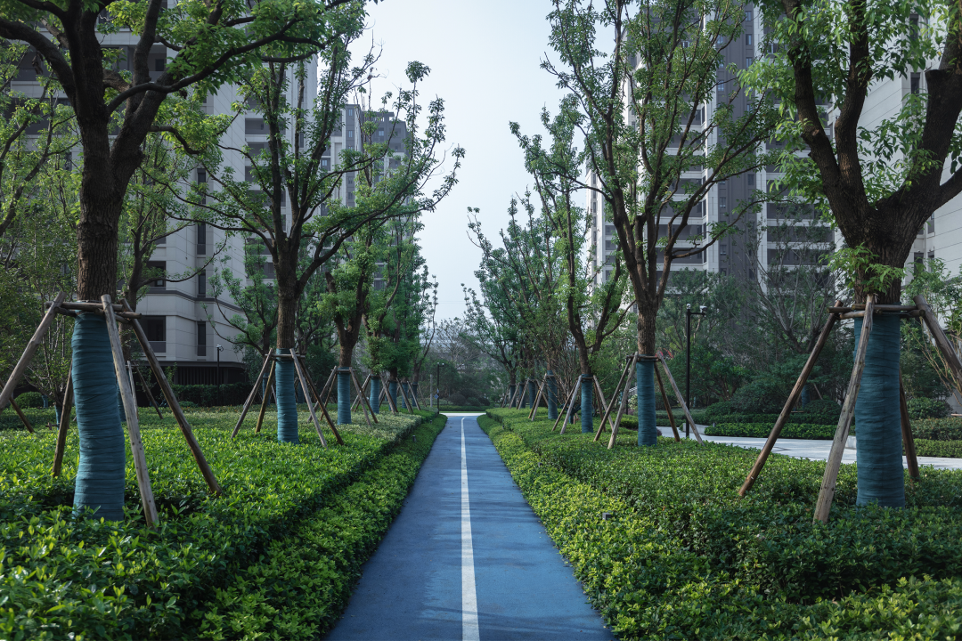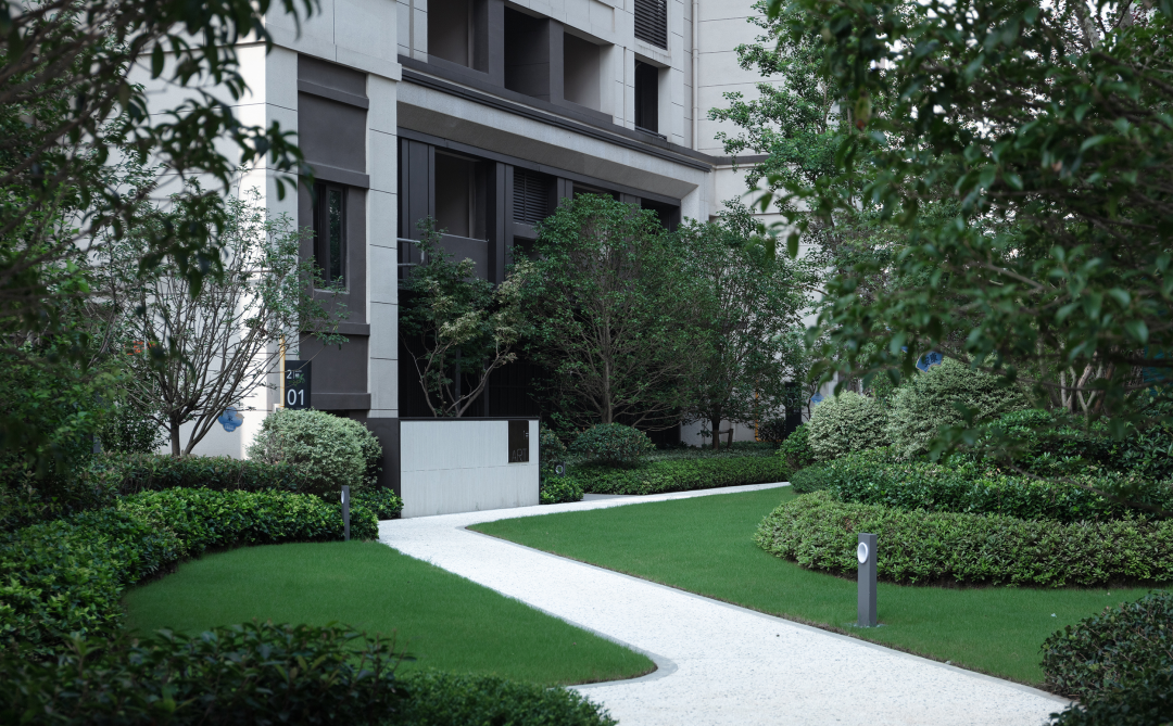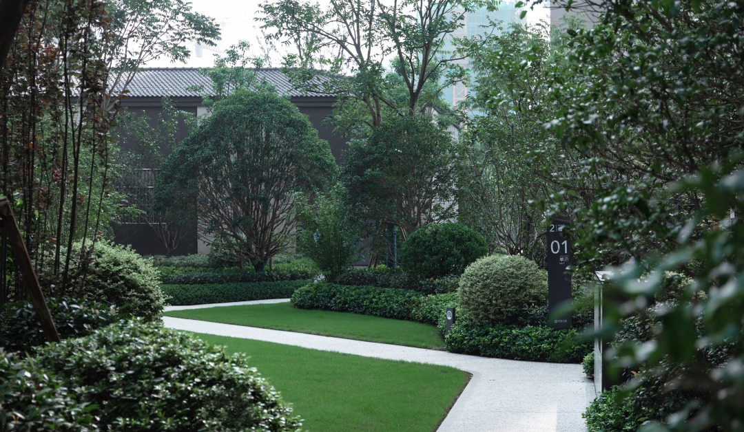该项目主要归家道路体系“林荫云谷”。从大空间转换至私密归家小空间至到入户门厅。全程重绿重氧,在乔木的一路覆盖下,体验谷中绿色轻生活。