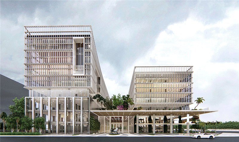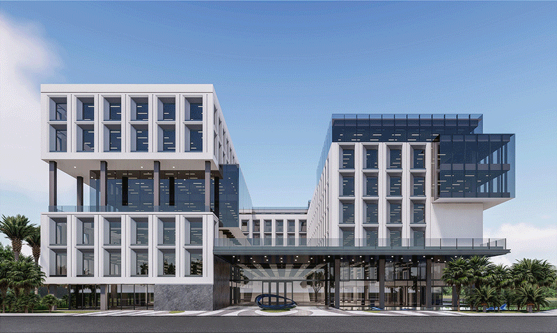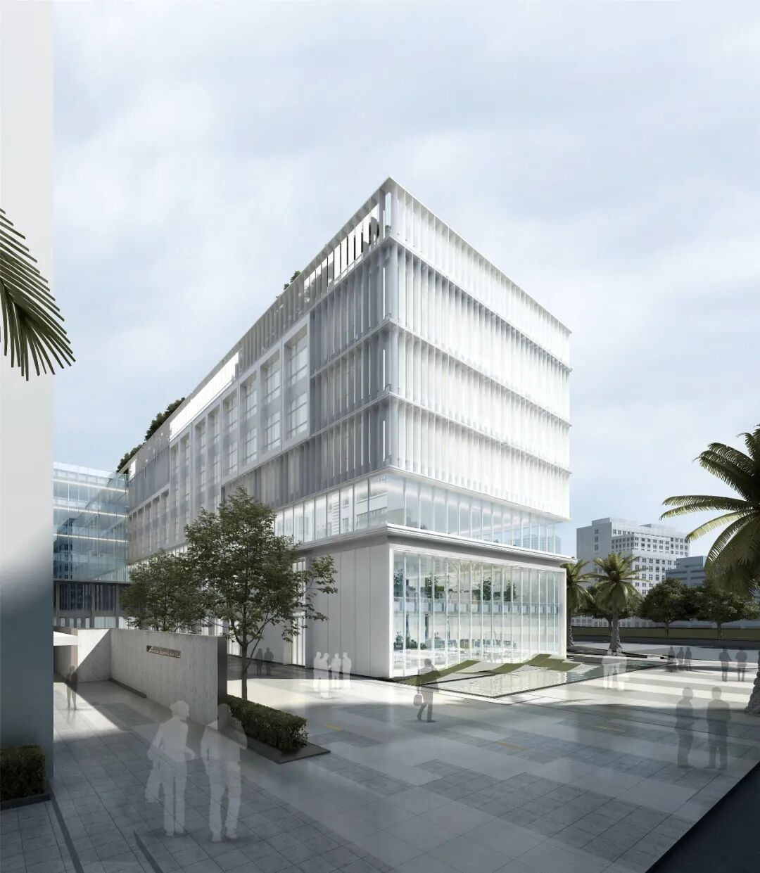 建筑以白色为主,在现有体量基础上,以中庭屋面结合入口雨棚外挑,将建筑分为上下两部分。下部作为入口,立面处理手法更偏向于商业办公,整洁通透,仪式感与次序感更强。上部作为酒店客房与培训,立面处理更艺术性。采用格栅包围,使建筑上部与下部产生形体上的对比。同时格栅不同位置处理不同形状的洞口,呈现丰富的立面造型,使建筑整体观感更具现代艺术气息。