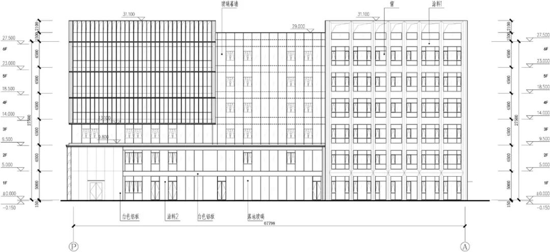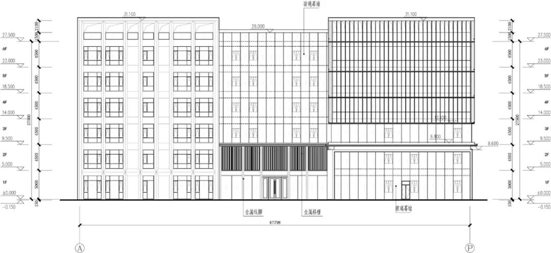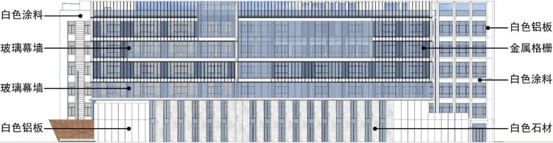 ③ 构架利用玻璃幕墙、竖向格栅、留白等多种表皮模式。在立面上形成趣味的错落关系,打破过于理性的框架并给予室内充分的采光采景;