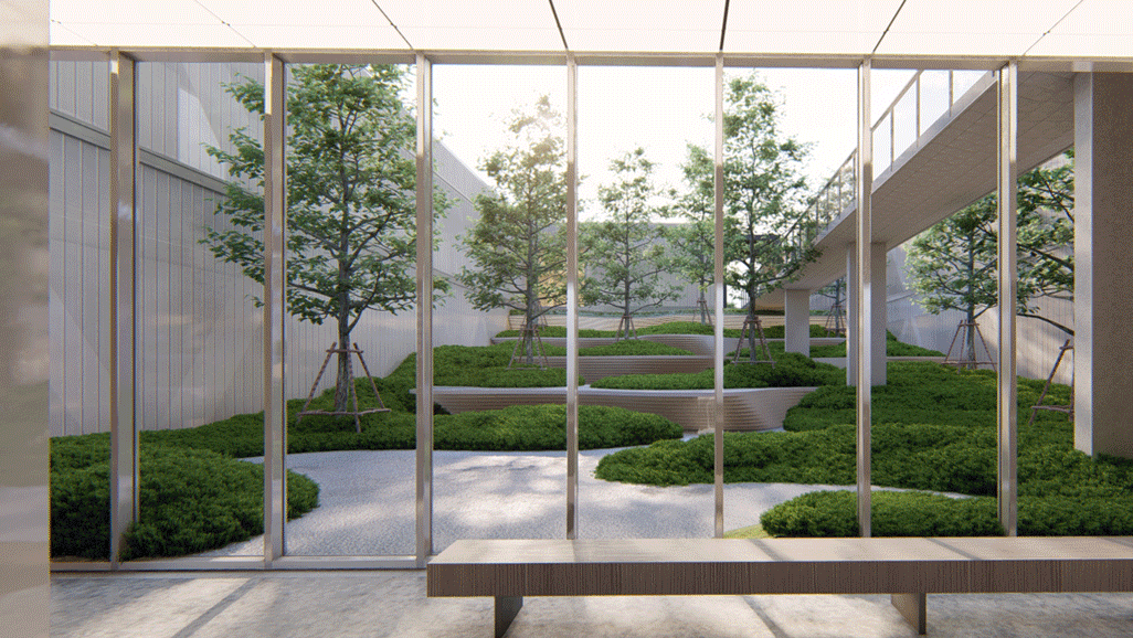 中庭通过四级层层叠叠的阶梯式景观来消化4.5m高差。白色GRC材料作为立面,打造出纹理感,重峦叠嶂的山峰和溪流,近在眼前。