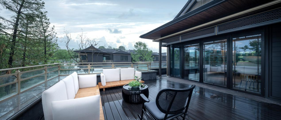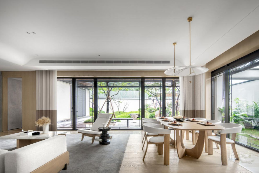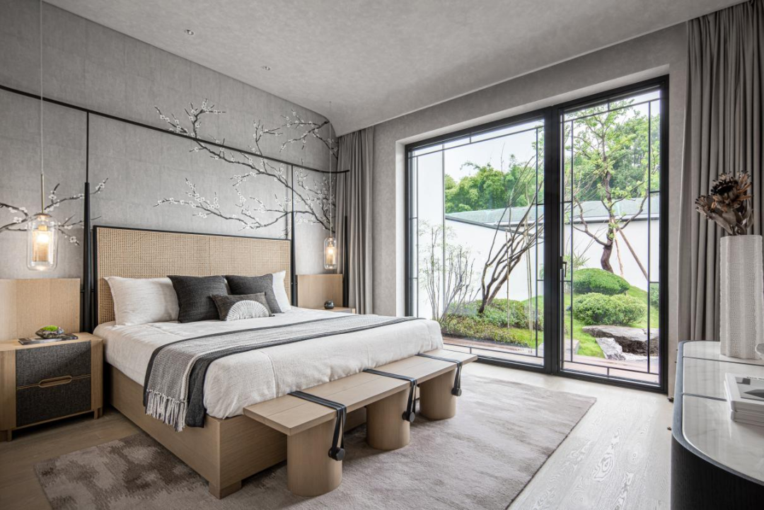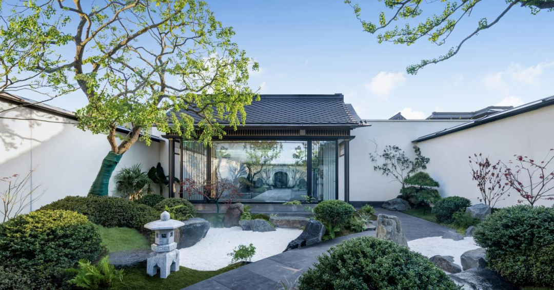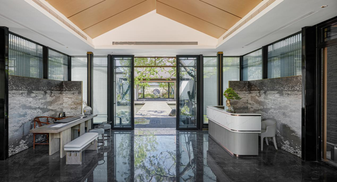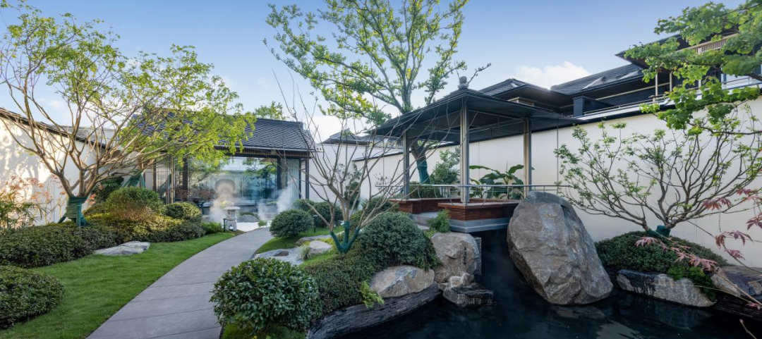 在园林设计上,沿用宋式堆山、理水、布花木的传统打造手法,营造叠瀑汇水,鱼沼飞梁的景致,通过入户院的过度,给人豁然开朗的宋式园林山水画的感觉。以白墙为底,花木巨石入画,结合临水廊院,形成内外互动、可居可游的宋式庭院生活氛围。在这里,生活美学真正成为了一个人可以贯彻终生的追求与享受。