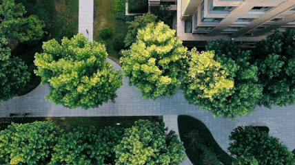 简洁现代的银杏大道,结合规则的草坪轴线,形成社区主轴的仪式感,通过银杏落叶的美好景象,打造景观在季节中的变幻感受。