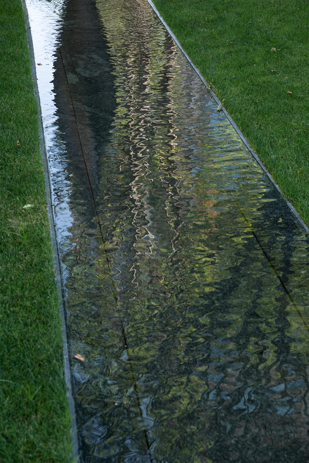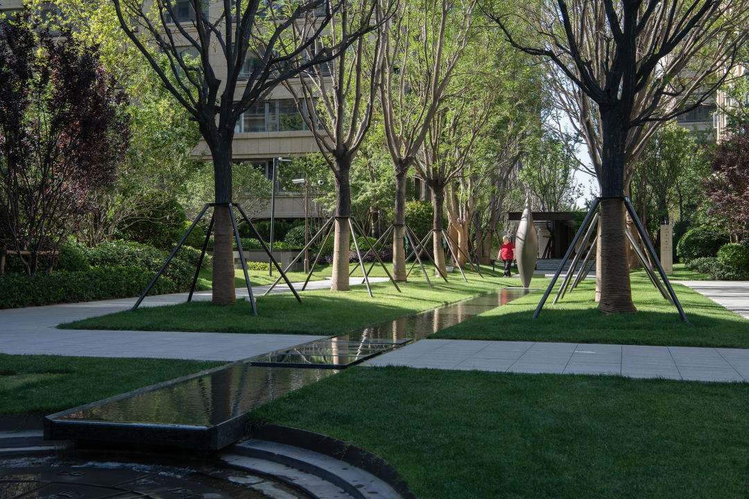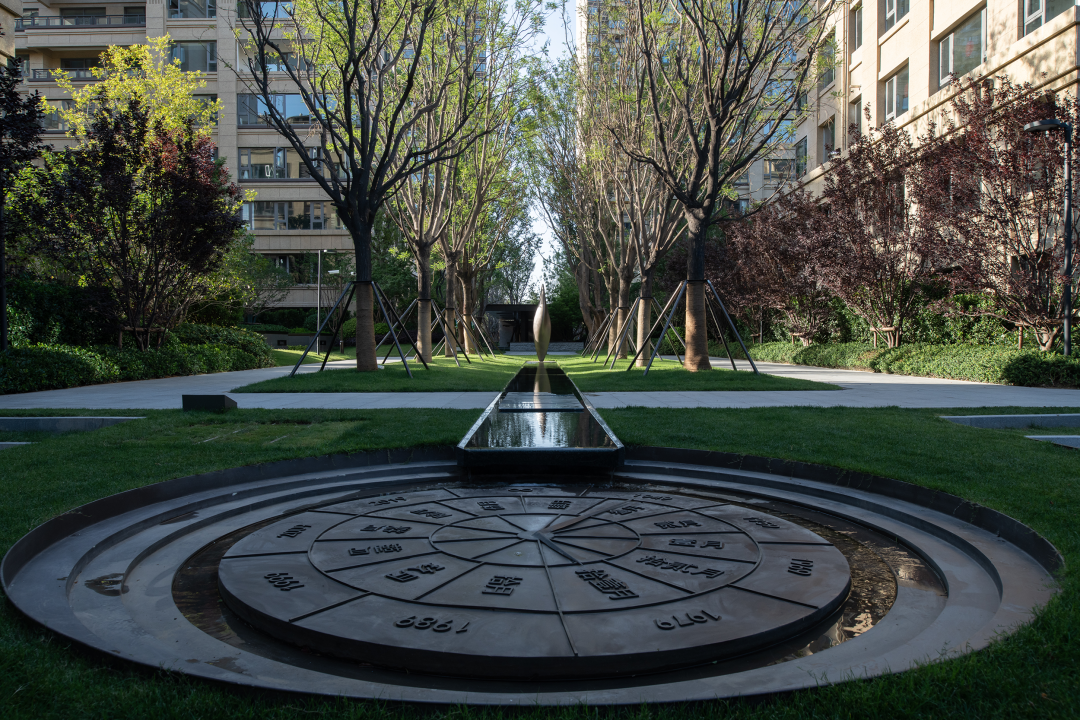 设计通过一条水轴打造,水轴面积:30㎡,水轴池底选用中国黑光面石材。通过雕塑和轴线的呼应关系,打造赋予历史印记的景观。