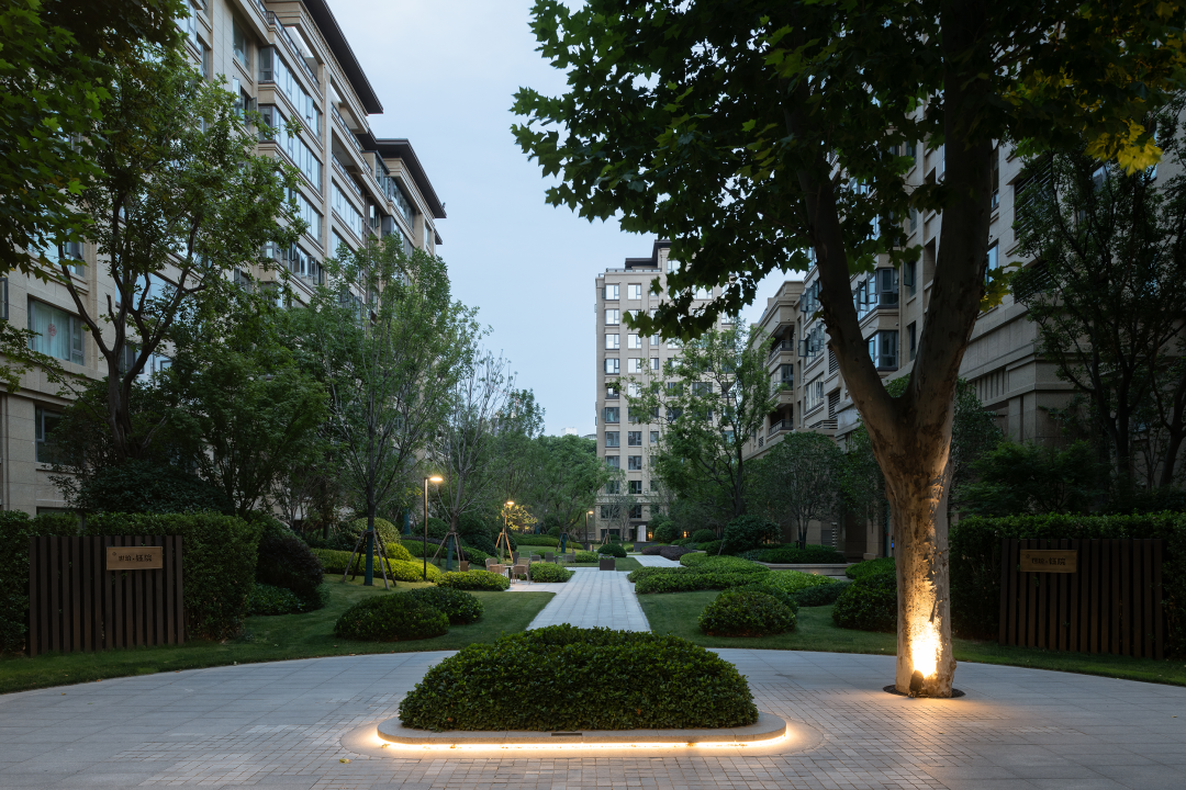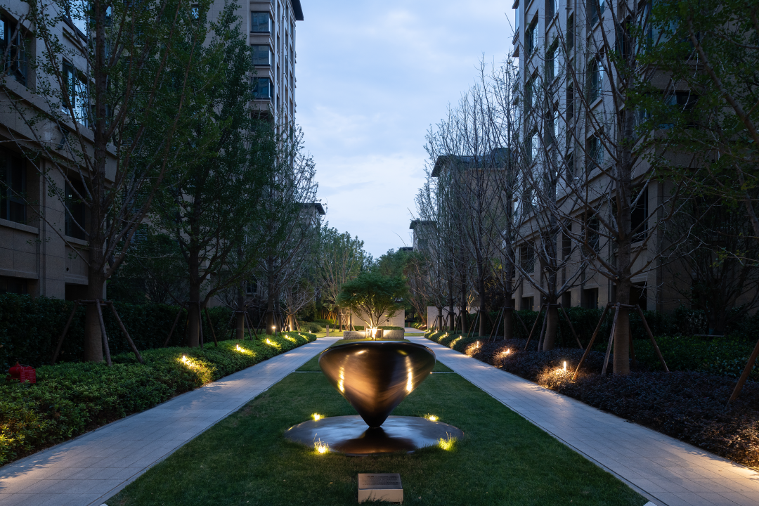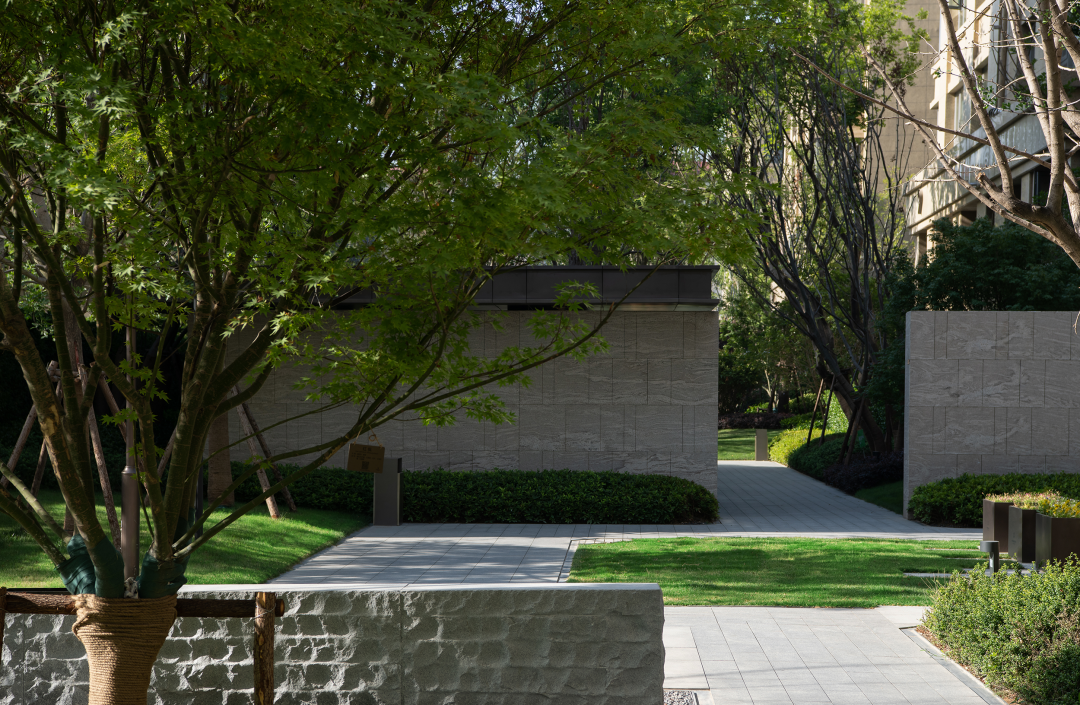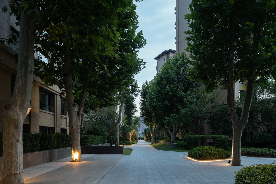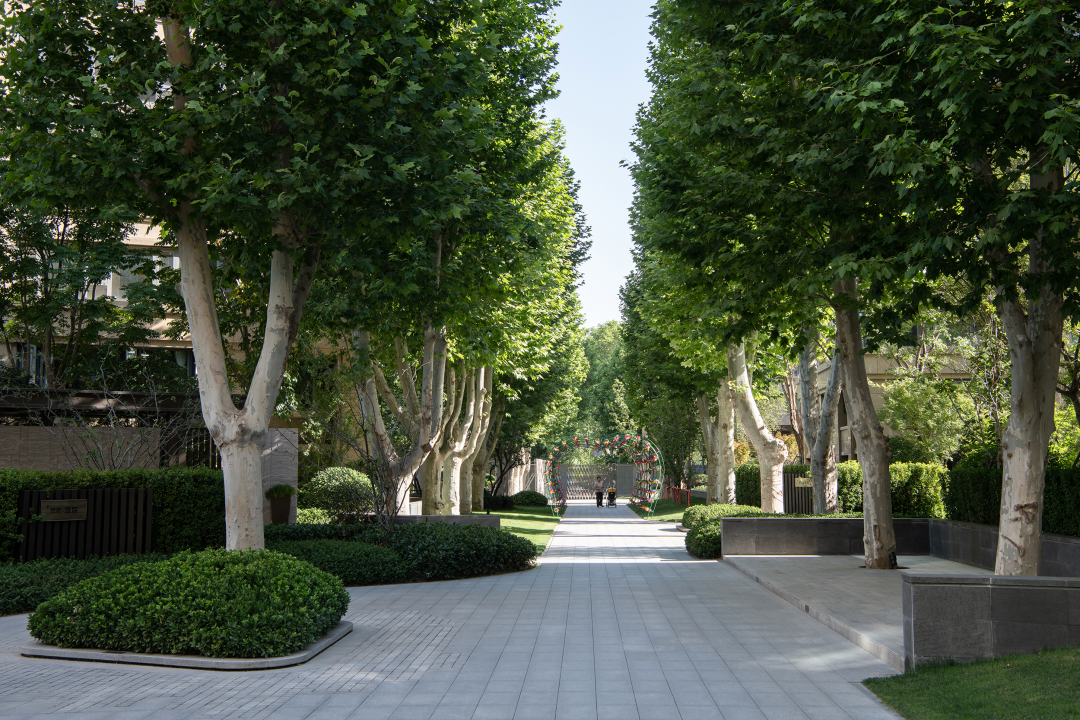 整条梧桐大道通过林荫绿地、绿坡景墙、主题雕塑、组团景墙以及活动场地的设置,形成社区内部一条具有生活场景与历史感的主题轴线。