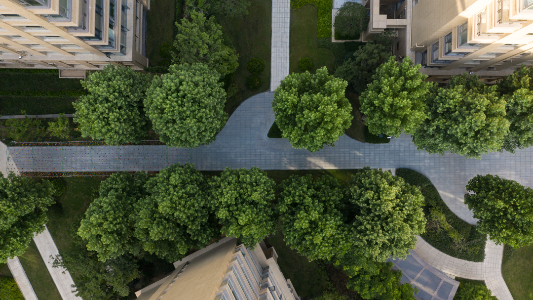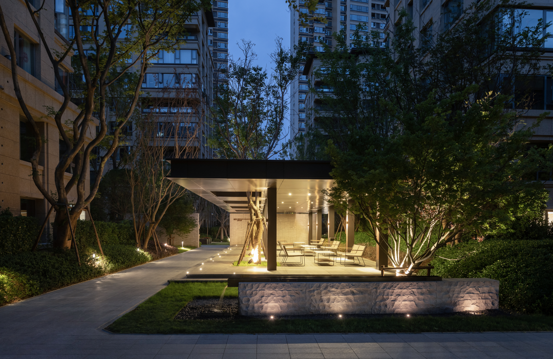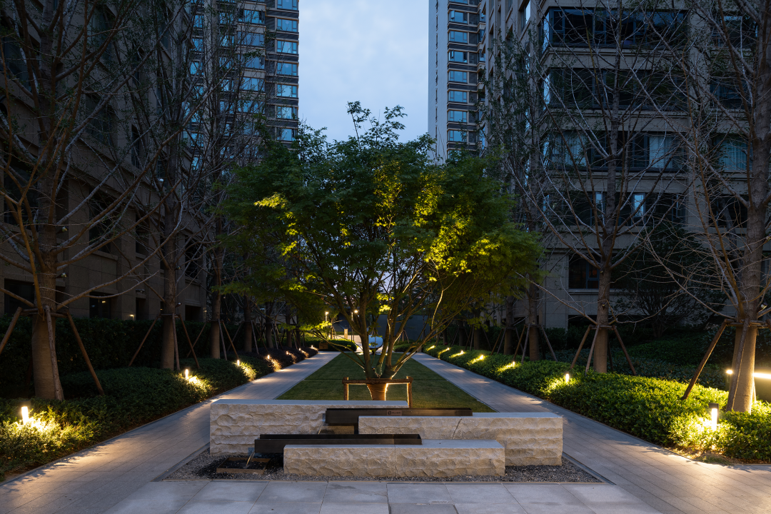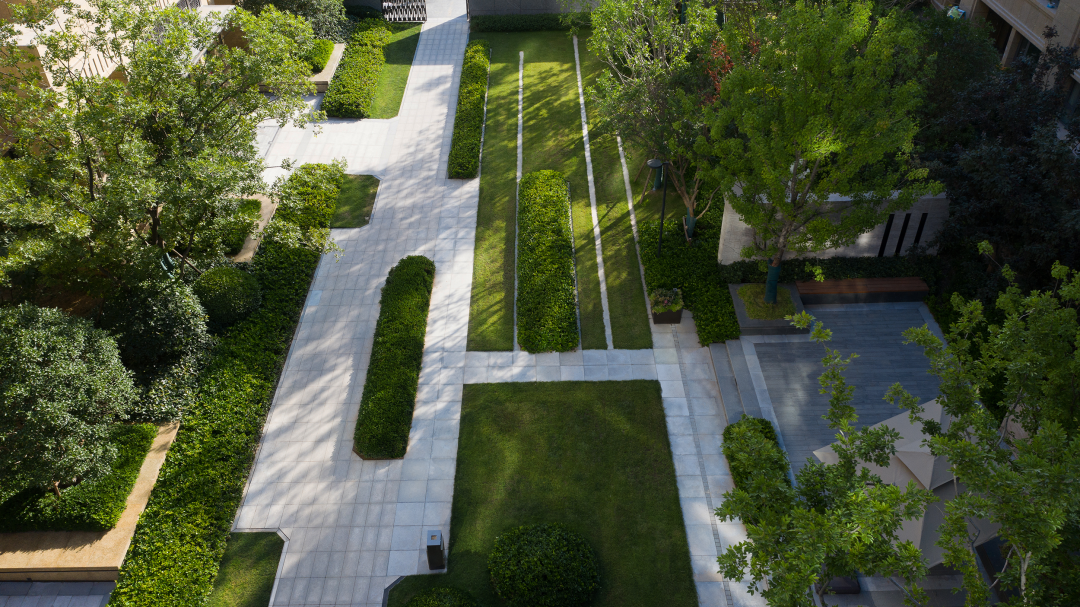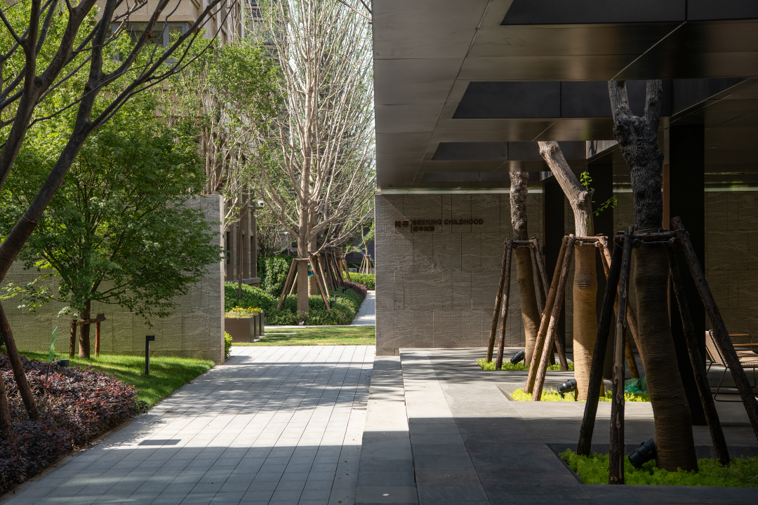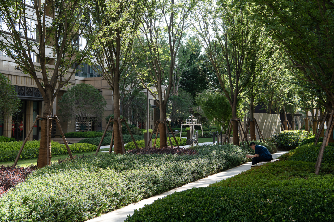 整条梧桐大道通过林荫绿地、绿坡景墙、主题雕塑、组团景墙以及活动场地的设置,形成社区内部一条具有生活场景与历史感的主题轴线。