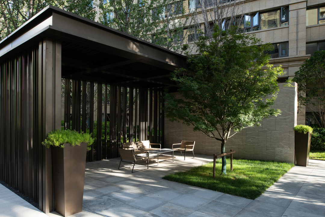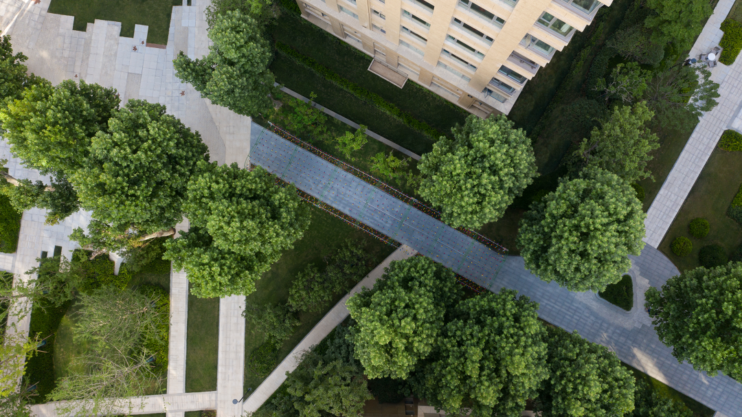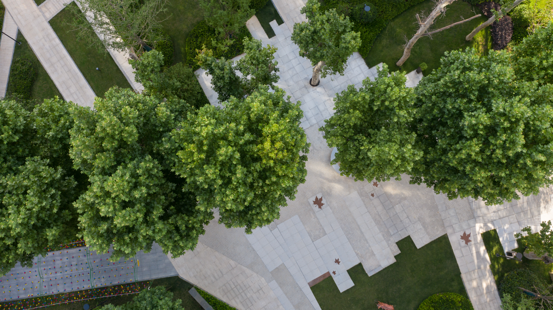 这里,高大雄壮的梧桐树,在烈日下伸展出翡翠的玉臂,蓬勃向上生生不息,搭起郁郁苍苍的绿茵。保留了场地原有的梧桐作为场地的记忆点,以岁月印记为主题打造一条景观与场地精神共生的浪漫走道。