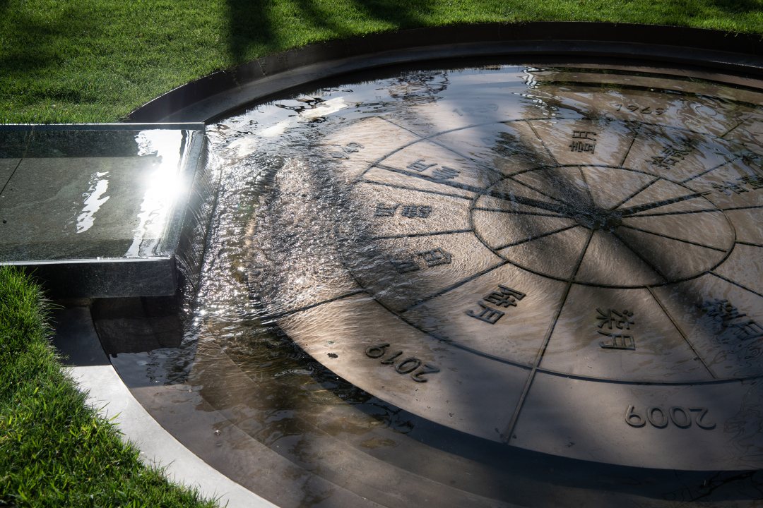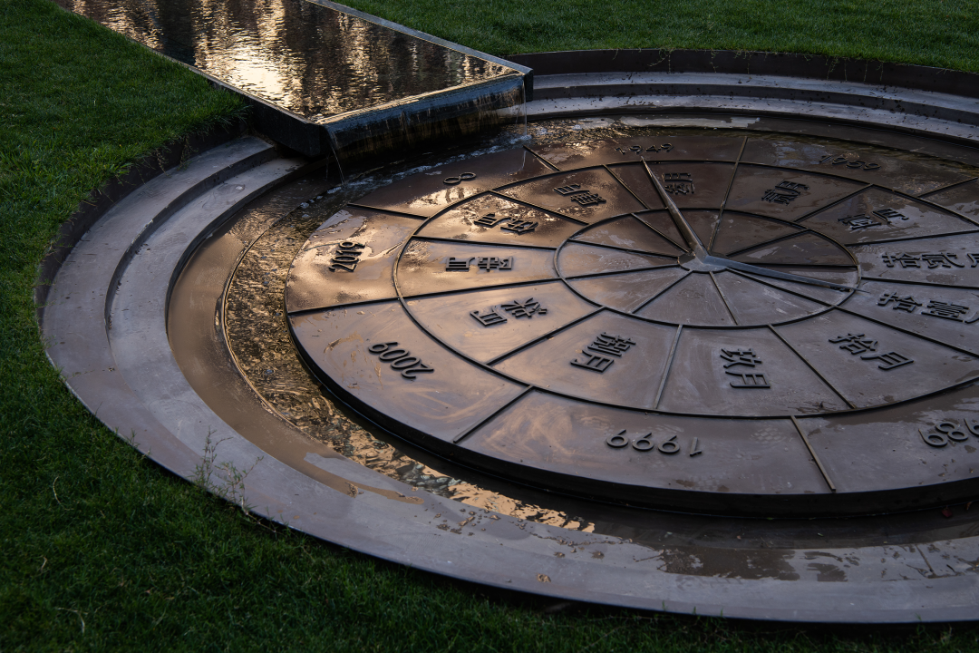 水轴的尽端是一个水盘,形成一个时钟,时鈡内共有年、月两个刻度盘,指针停留在1949年11月——郑州纺织机械厂成立,象征着场地的历史从68年前开始,一直延续至今。整个场景通过阵列的银杏树阵,形成仪式感极强的轴线景观。
