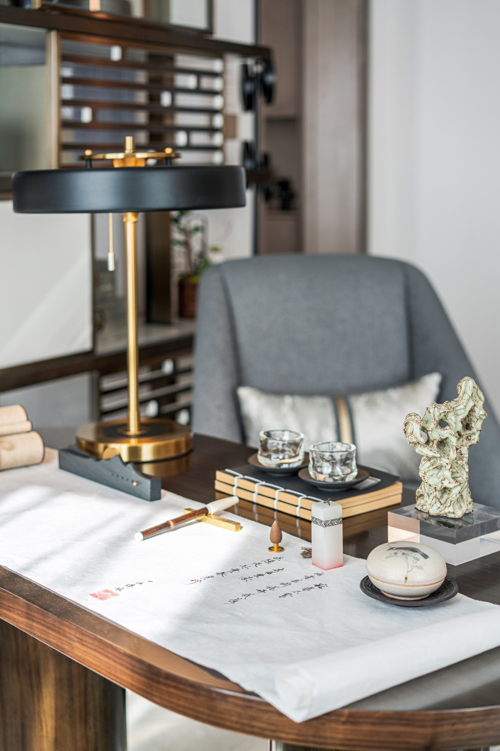 进门玄关用舒适的中性色做铺陈,暖色光源下,中国建筑线条搭配软装细节的风景意境,低调平和的中式元素延伸开展。