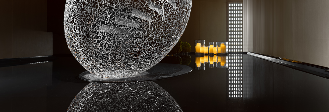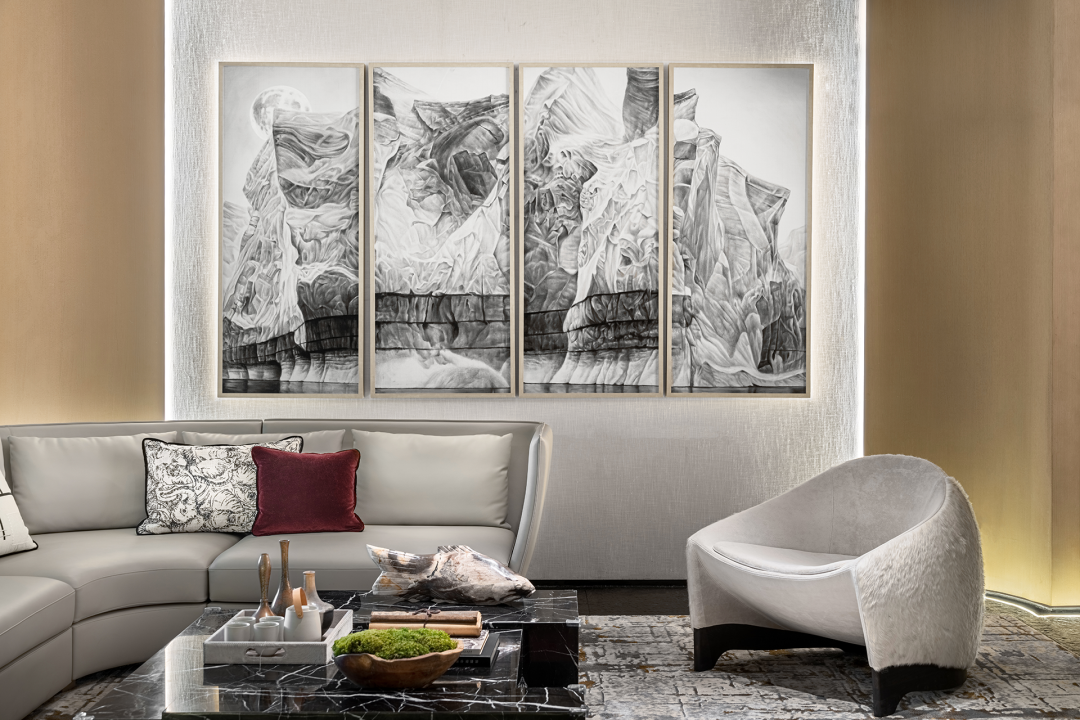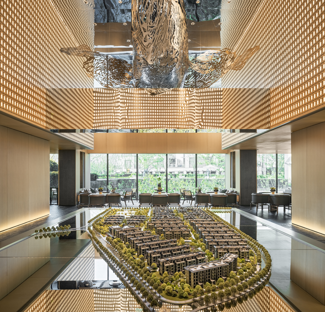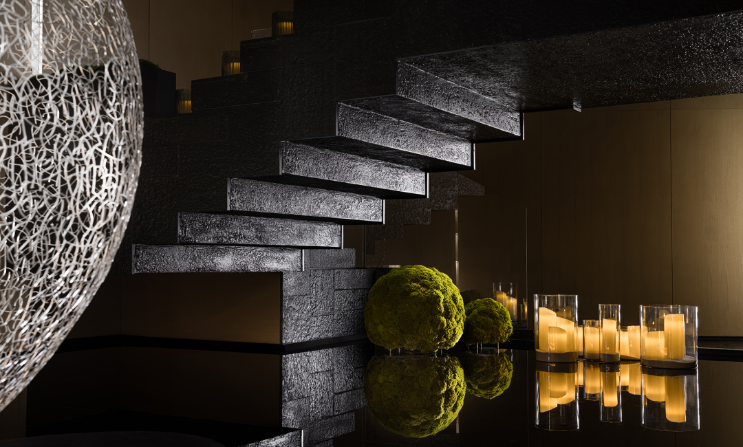 木格栅面亦框定了“依海而生”的沙盘区框架。“北冥有鱼,其名曰鲲。”神话故事中的“鲲”在沙盘区上方舞动,击起汹涌波涛,有如浩瀚的海面倒映于天花,漂浮的动态削弱了沙盘区的厚重体量,呈现海岛般的轻盈。依凭仁恒・海明院独有的海岛生态,艺术楼梯区域创作了一个「梦幻生态岛」。设计师透过大胆的想象组织了一个极富梦幻的空间,空灵艺境中漂浮神秘生物,黑色楼梯仿若通往宇宙的另一星球。