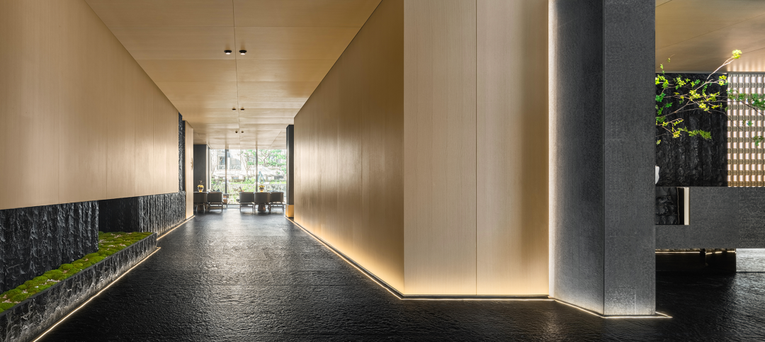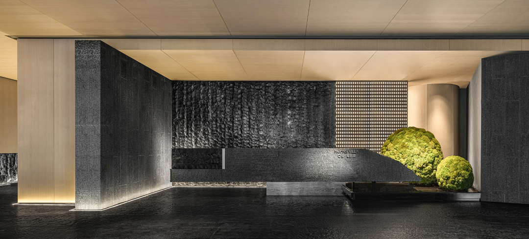 前厅以巧妙的分割剥离出一个线条与层次分明的包容性空间。石面粗糙质地带来的是与自然的原始风味深刻衔接之感,绿植元素融入其中体现为东方设计特有的禅意。