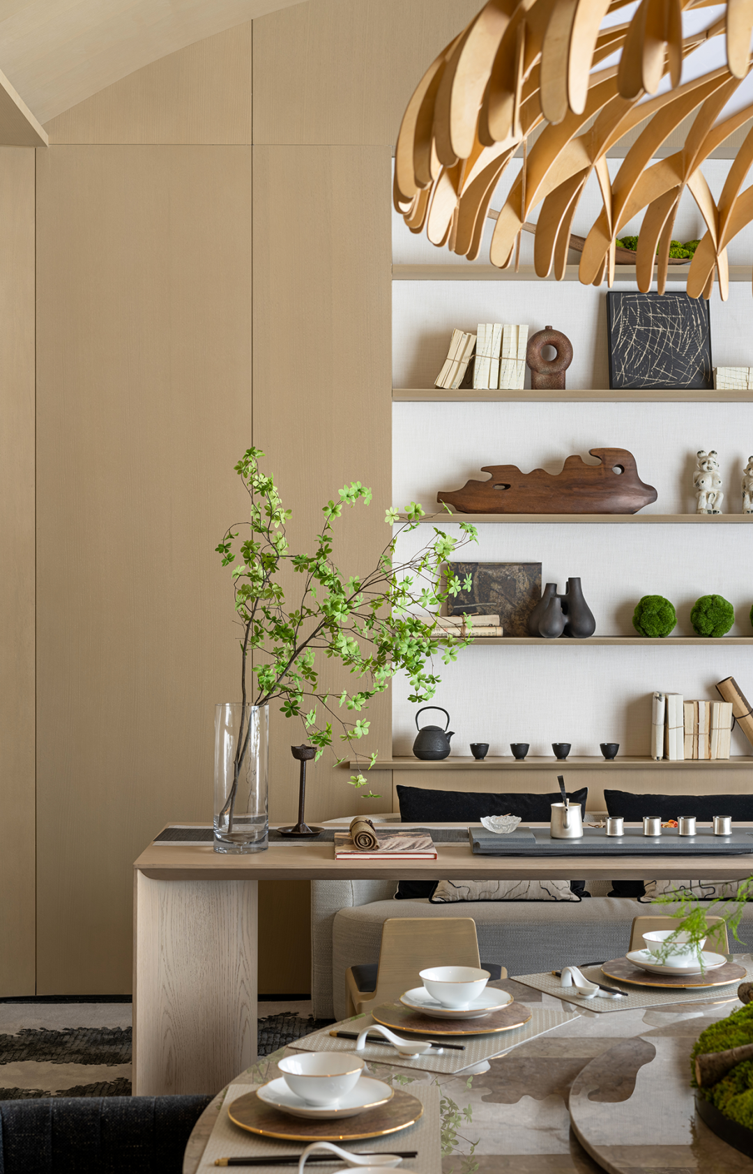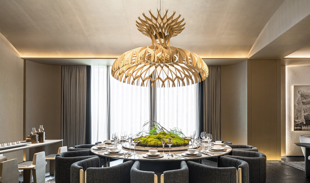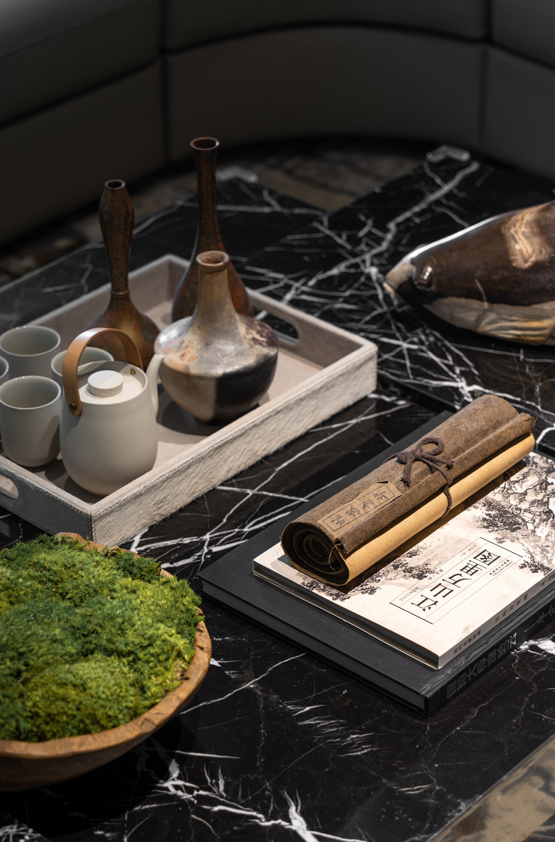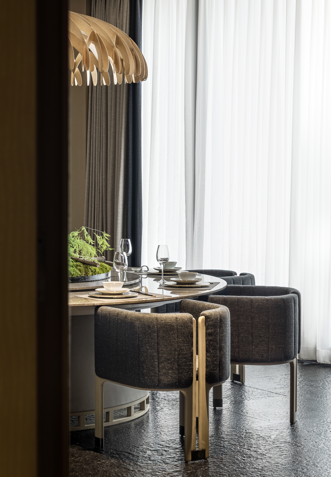 东方意境的营造是空间灵魂所在,而颜色的组织则针对不同人群,局部色彩的调和创作出风格多元的包容性感受。中国传统水墨画气韵生动、以形传神,设计师以此为创意基底,将其拆解为私宴与娱乐区色彩与材质的搭配。圆,在中国文化中代表圆融、圆满。圆桌的设定呈现于就餐情境中,代表人和美满的希冀与祝愿。器物展陈为空间注入审美趣味。美物抵心,细腻的纹样糅合温厚触感,香浓之余,弥散着匠人手工艺触手可及的温度。