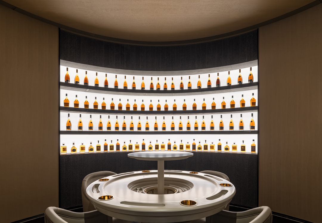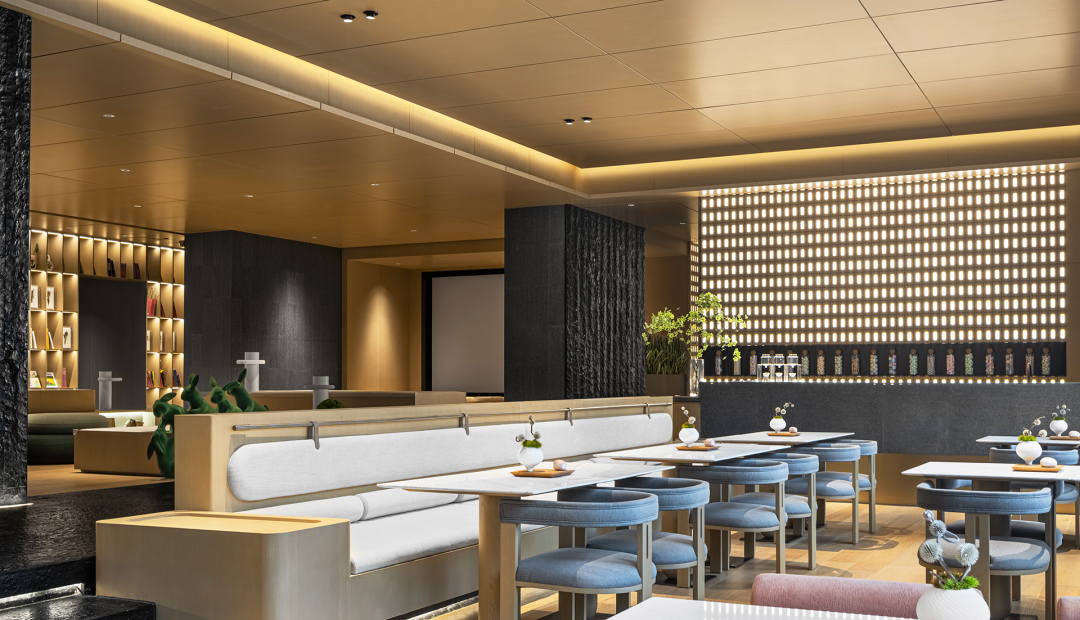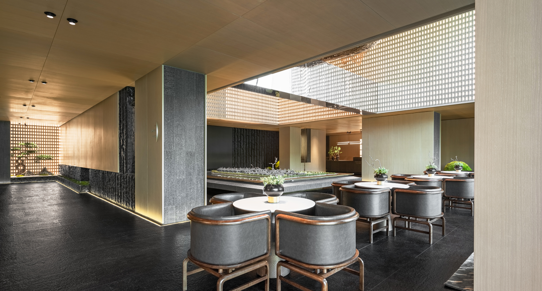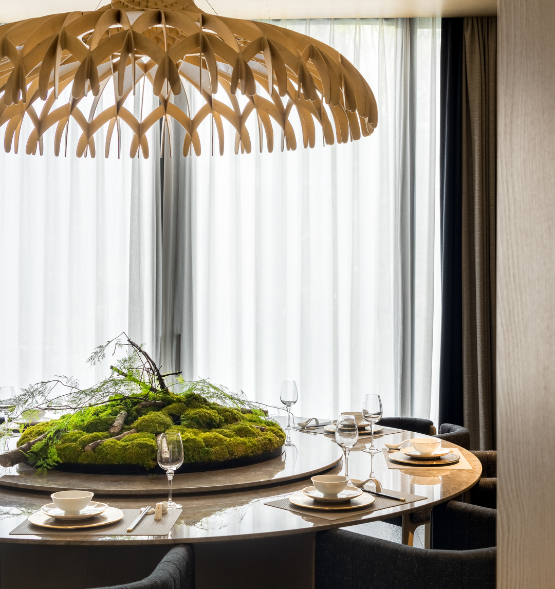 东方意境的营造是空间灵魂所在,而颜色的组织则针对不同人群,局部色彩的调和创作出风格多元的包容性感受。中国传统水墨画气韵生动、以形传神,设计师以此为创意基底,将其拆解为私宴与娱乐区色彩与材质的搭配。圆,在中国文化中代表圆融、圆满。圆桌的设定呈现于就餐情境中,代表人和美满的希冀与祝愿。器物展陈为空间注入审美趣味。美物抵心,细腻的纹样糅合温厚触感,香浓之余,弥散着匠人手工艺触手可及的温度。