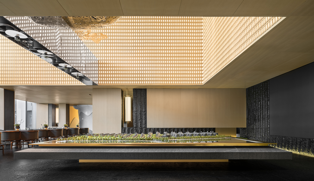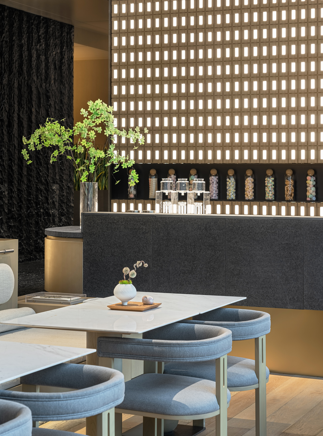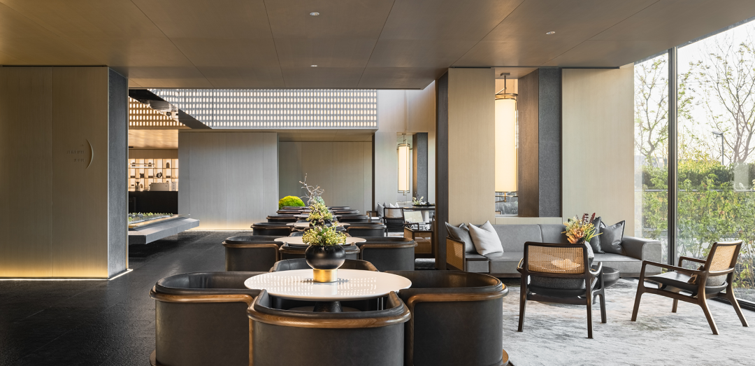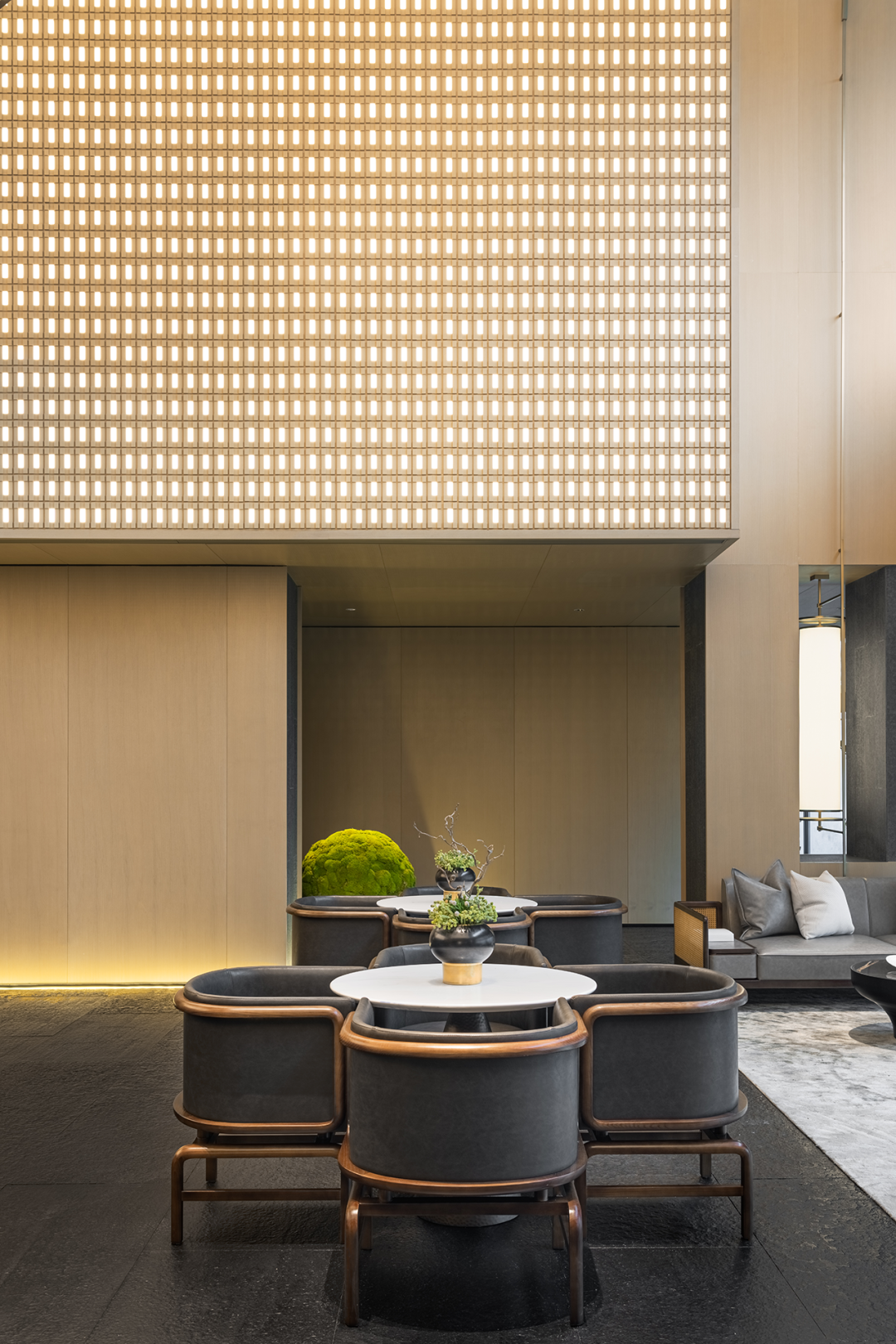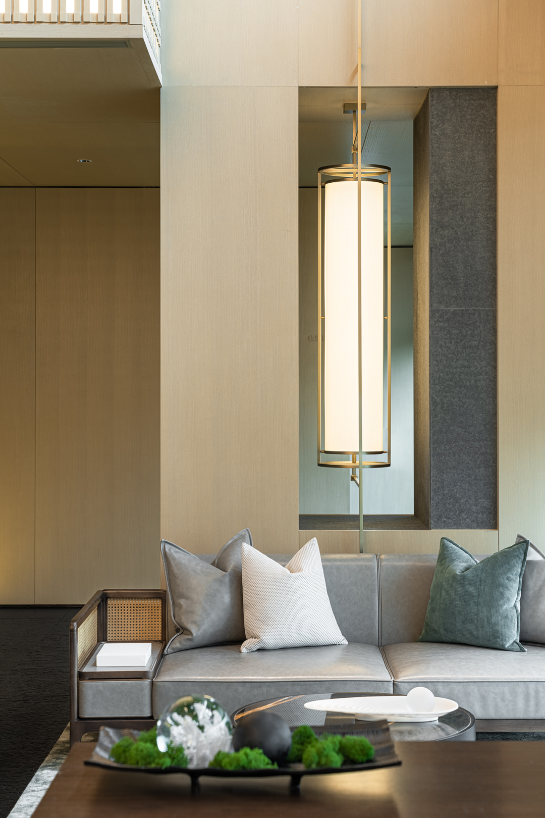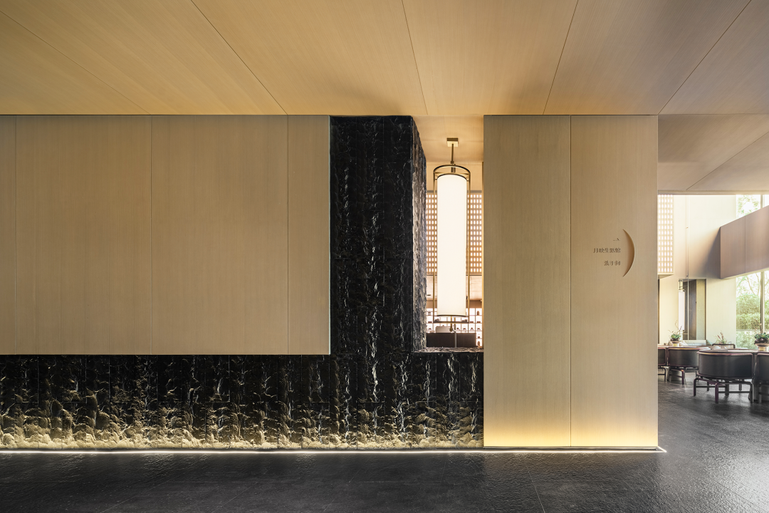 点、线、面,光线的形体创造过渡出柔和的空间层次。局部布光微妙如细微的雨滴,迷蒙散落角落的盈盈微光,映衬着绿植盆景的苍翠、清新。木格栅将硬射光柔化,带来大幅面光的创造。原木始终为空间基底,体块与线条的切割让现代与古雅交织,明暗交融中,衍生出东方特有的意境之美。设计师将光理解为一种情境的创造,通过材质与工艺将其分割出多种形态。点光源以金属材质赋形,磨砂面调和暖黄灯光。石材与原木饰面交叠运用,宛如中式山水画的背景,委婉写意。局部跳脱的灯光处理是匠心的画龙点睛之笔。