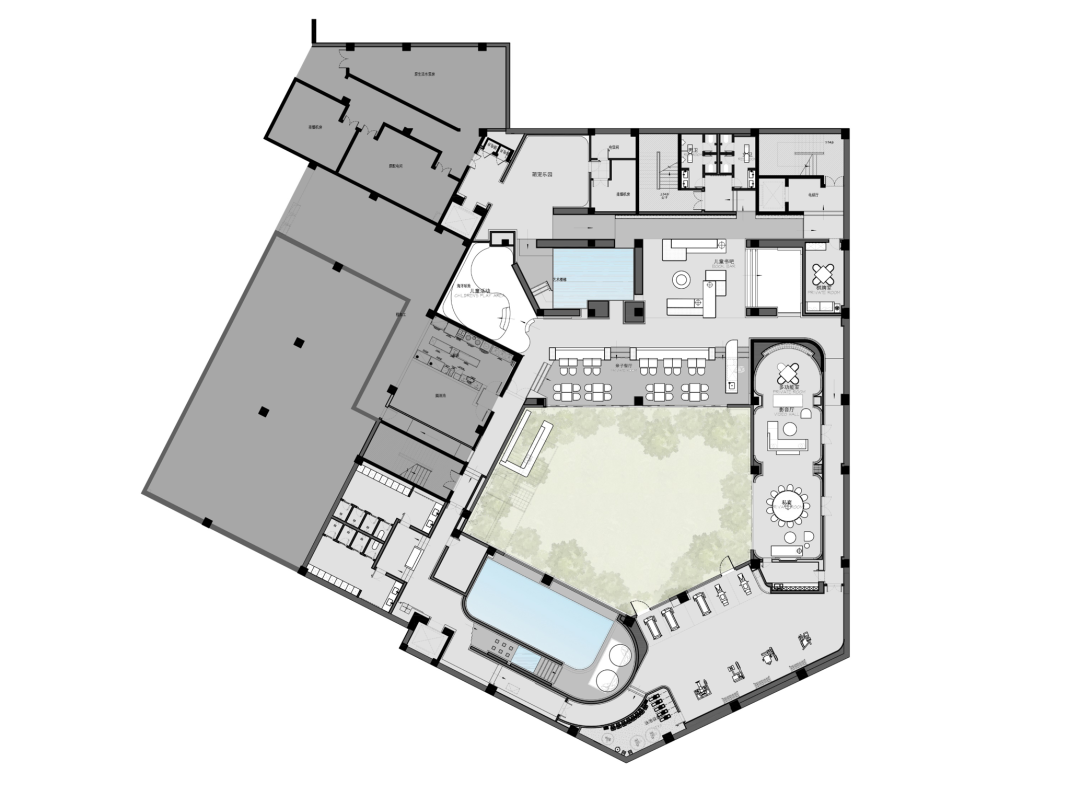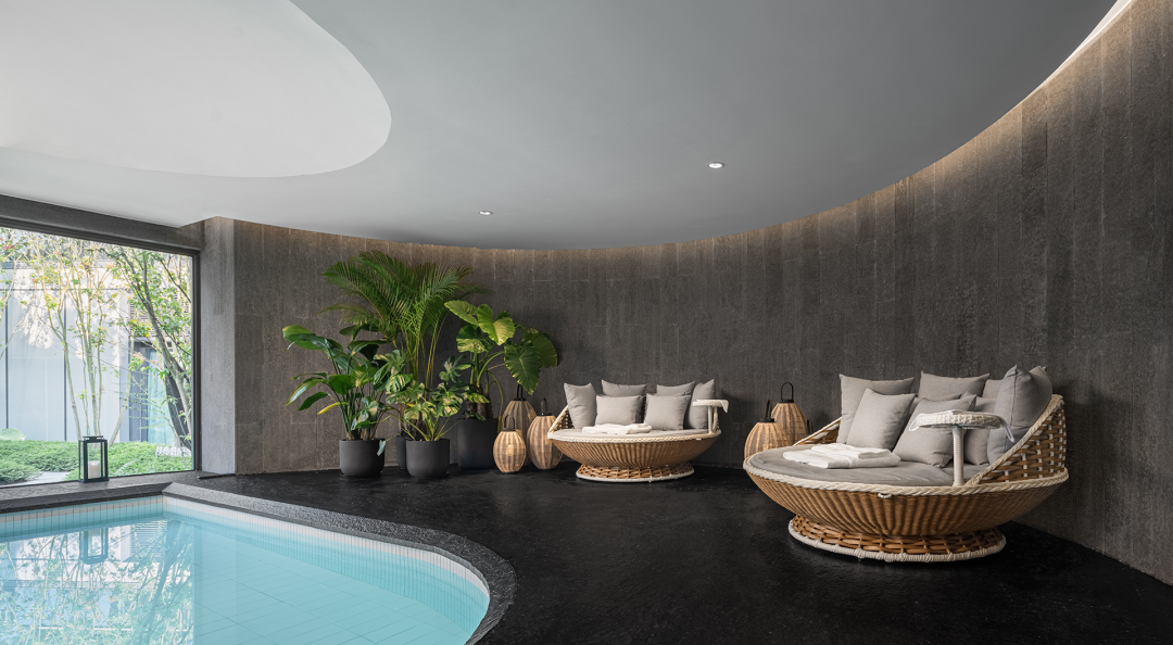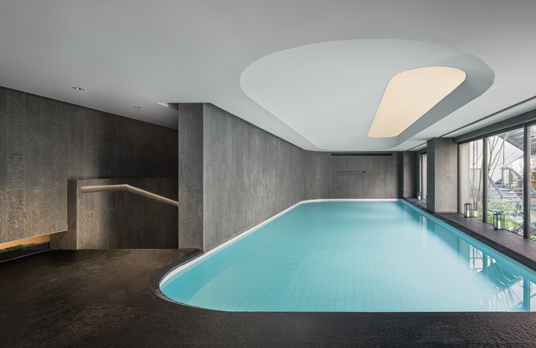 现代抽象画的选取将简洁的空间大肆泼墨,宛如呈现嶙峋山体,尤为匹配城市绅士的独有气韵。娱乐区域将木饰面以更多层次的颜色展现,灯光透过罩面柔化处理,带来美学展陈的优雅序列,幽深、暧昧的氛围创造为空间注入和雅之味。空间功能形态多元。泳池空间与户外景观融为一体,休闲与舒缓中,得以与自然实现能量交换。天花切割形态柔美,带来局部光照的调和。