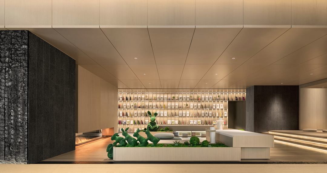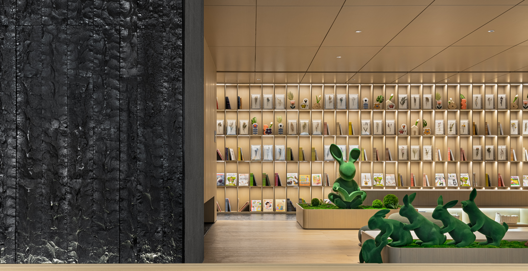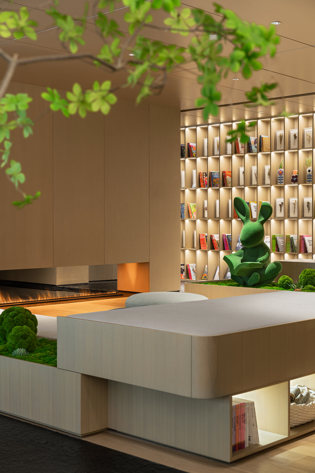 紧密或稀疏的线条排布彼此交叠,舒适的秩序将极简的东方意境委婉道出。通过美学展陈的方式,设计师组织出一片静谧而沉静亲子阅读区。动的脱兔,静的坐区。绿植元素在此处变幻为景观型的小品。木石相依,材质运用与整体空间一体,收纳、美学展陈、阅读功能在此处依次巧妙融合。现代与中式风格柔软交织,简净而脱俗的风格自觉练就。简白、原木、翠绿呈色经典,灯光雅致氤氲弥散,对日常场景的氛围营造使得阅读与休闲颇有悠然自得的生活境界。原来,居于海,藏于院,便可“悠然见南山”。居于自然,返璞归真,这是一种生活哲学,对建筑空间而言,则是一种人与自然共生的思想与观念。设计师拆除繁重的墙体,运用大面积的玻璃窗搭配纱帘为室内引入充裕的面光,意在传达对着自然环境的敬畏,让建筑空间与环境美好共生。在人与自然的互动中,设计师希望人与人之间的互动也可以是更为亲密的,因而将就餐与社交场景融入社区生活之中。亲子餐厅特别针对社区群体,长座椅巧妙兼顾了空间分隔,多元的对谈、就餐场景带来更为丰盛、融洽的社交与互动。
