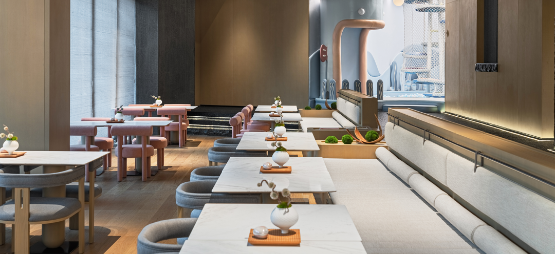 极简的空间由于恰到好处的秩序组织得以承载更为丰厚的功能与活动。线条的分割带来更为平铺直叙的温和律动与天然美感。灰与粉,都是浪漫的颜色,如白雾晨曦,与光的交汇中,带来拂面而来的清新气息,铺染于座椅区,带来深度安心的亲密触感。