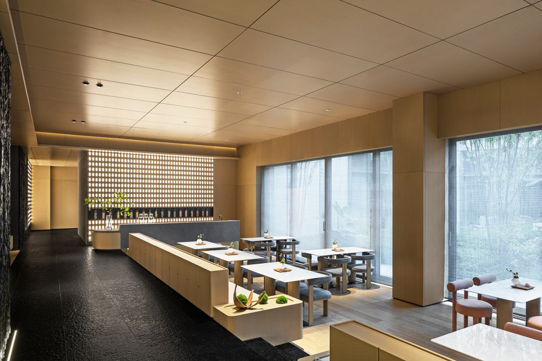 水吧台区域的分隔巧妙削弱体量感。简明利落的线条消弭餐厅与访客的距离,融合性的空间组织使餐厅服务、就餐过程更有秩序的美感与恰当的亲疏距离。