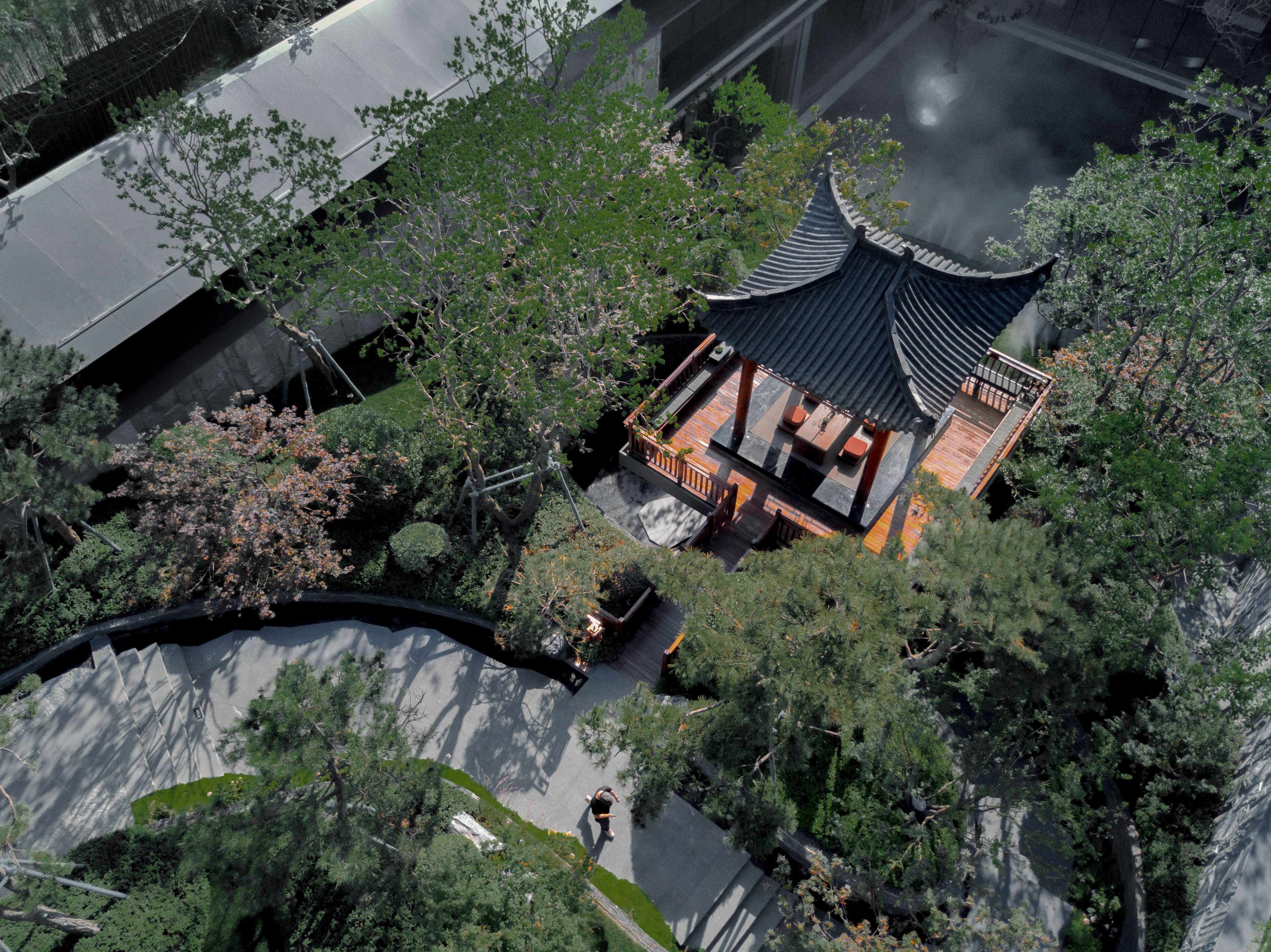 后场在完成空间立体交通转换的同时,设计用流泉叠瀑、坐山古亭,展现院墙之内方寸天地包容万象之感,利用下沉空间营造围地而居之、居水而乐之、乐樾而息之的生活意向。