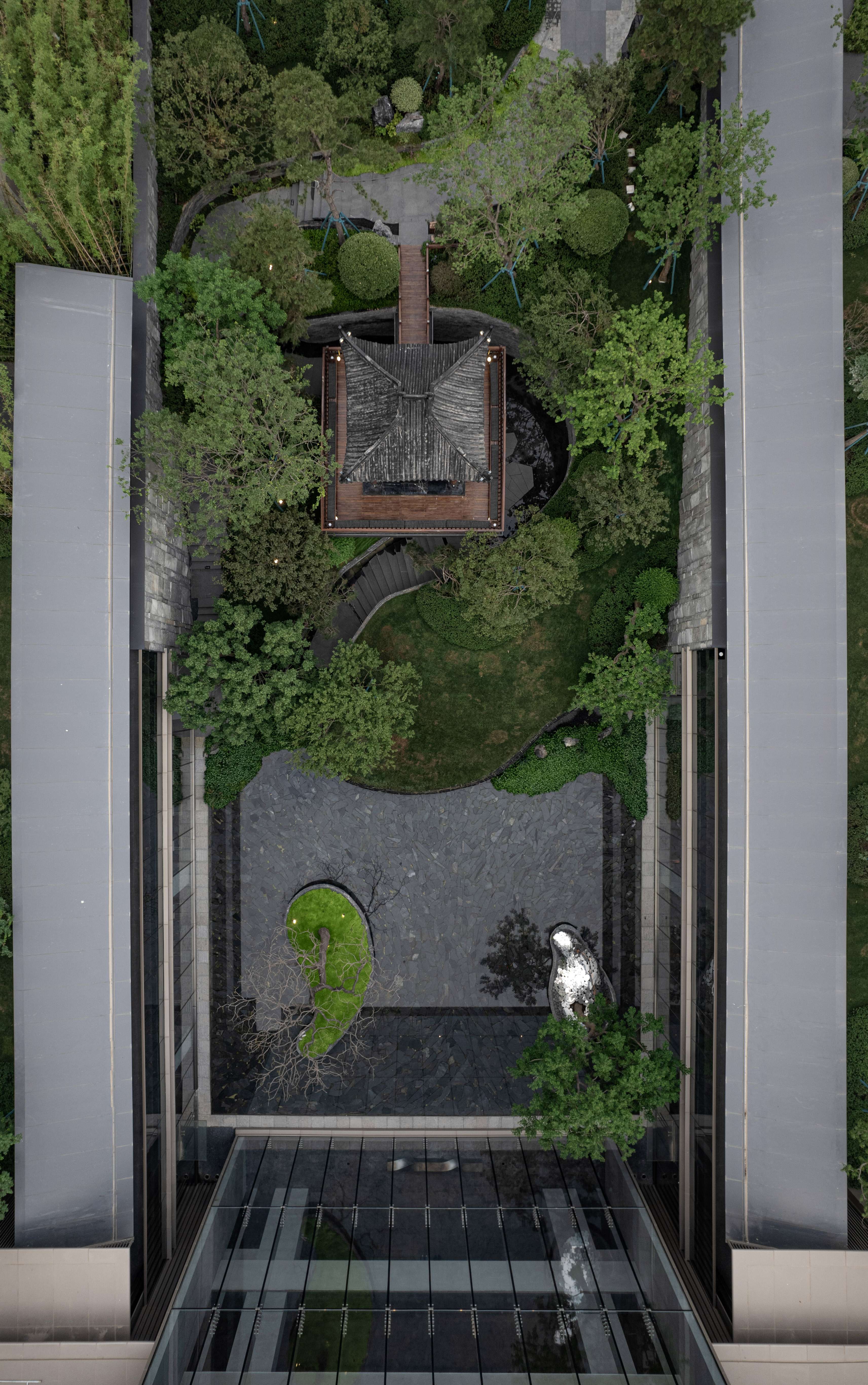 在经过建筑以后,下沉庭院是示范区景观设计的高潮。建筑与景观镶嵌、又在对立之中创造出平衡相容之美。景观在被建筑及现代的玻璃幕墙环抱以内,身处在建筑之内可由不同的角度观赏方寸间的层林浸染。同时眼前的山水画亦是可进入的,通过两侧的长安屏风连廊进入古亭,或是有林壑山川中游园般、须臾之间的别有洞天,都是经由与山水融为一体的动线,流淌之间进入园中。
