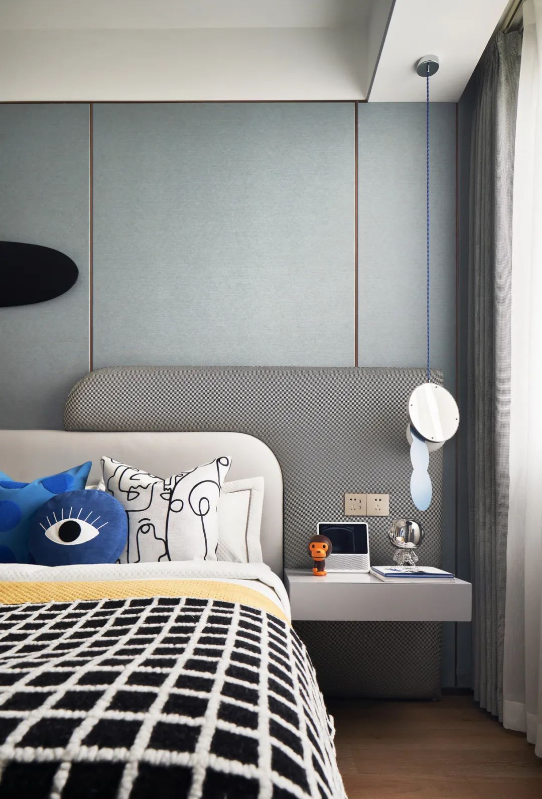 设计是对美学的凝练,而空间刚好就是包容爱好的载体。儿童房不止供给孩子居住的单一空间,更是孩子的一片小小宇宙。清新的灰绿如同孩子们纯真的心境,玩偶、冲浪板、大眼睛抱枕等充斥着童趣的元素,表达了孩童对世界的好奇,穿梭于广袤无垠的心灵海洋,遨游于自己的幻想阵地。