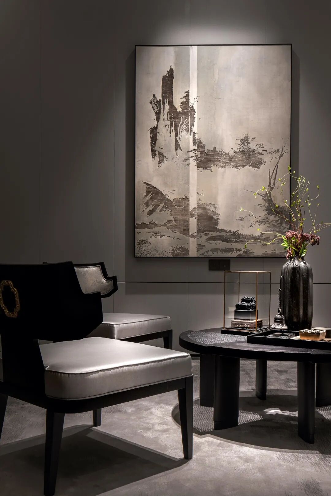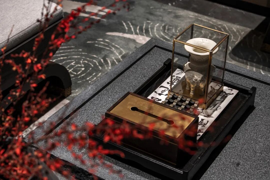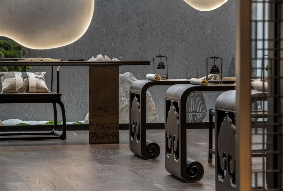 《南宁府志》记载:五象岭“山势雄峻,拱向城廊,为邕之服障,五峰相倚,如五象饮江”。于是,在邕州八景之中,就有了“象岭烟岚”的美名。循着这气象万千的景观与传说, 陈设设计选用了棉麻织物、实木家具与灯座,强化了洽谈区中浓重与清逸,古朴与灵秀等层次丰富的内涵。粗粝的原石包裹了茶几的外立面,流动飘逸的云纹漫上了精工细作的木雕,恰似山麓间漂浮千年的雾霭烟岚,仍诉说着浩瀚历史中雄壮的景观。