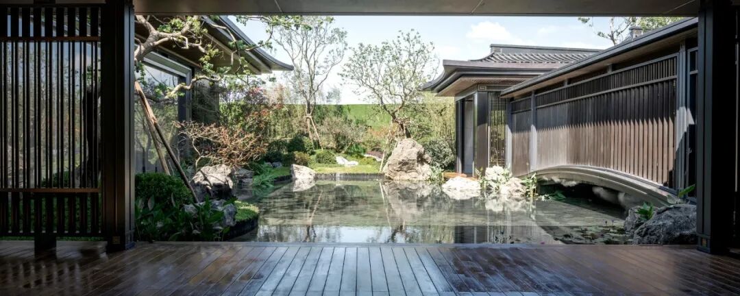 本案的平面布局遵循着中国古典园林中层层递进和曲径通幽的巧思:三进院落,回家动线掇山理水。一进「清风禅庭」参禅悟道;二进「清风明月」聆听自然禅意;三进「清风池馆」抚琴静坐,澄澈心性。