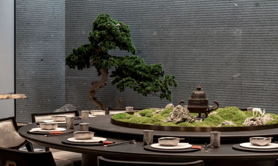 为此设计师的妙笔在处停留,让“邕州八景” 中的青山松涛,拂过了待客的清风禅庭。原有的空间设计中的格栅化为了松林竹坞,而巧妙的陈设设计让月亮的光晕洒在了“松林”间 。松涛翻月,宾至如归。