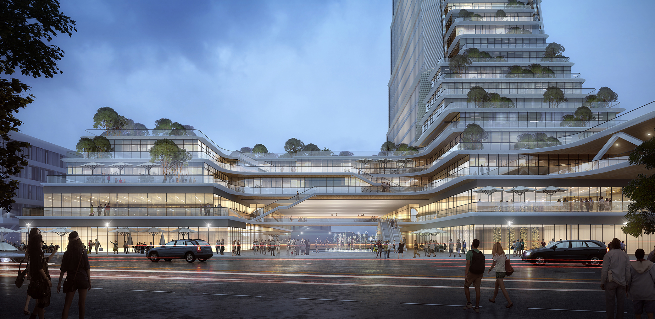 商办高层综合体以“帆”为灵感 ,建筑从裙房到塔楼层层退台,形成整体的斜面,简洁现代的玻璃幕墙构成塔楼表皮“帆影”的意向。同时呼应翠微山山景,通过地面绿化、空中绿化、景观花池的设计,将垂直绿化从地面延续到空中,营造立体的室外活动空间,凸显出塔楼城市地标的特性。