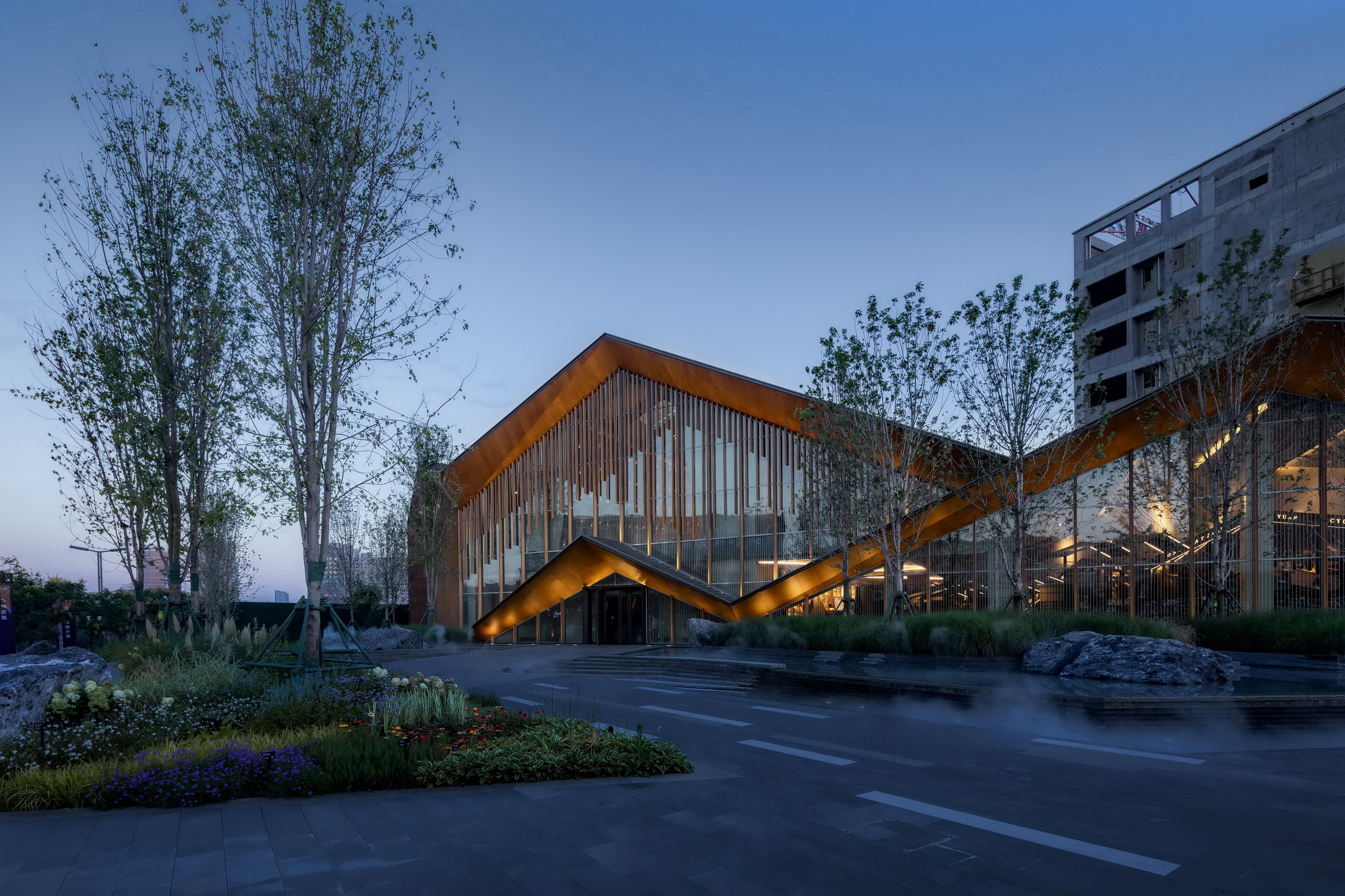 植物的选择有别于传统展示区的植物种植方式。为了以后与场地其他区域打造完整统一的沿街立面,结合太原的气候特色,设计师选取了挺拔的美国红枫作为主景树,与建筑的山形立面交相辉映。