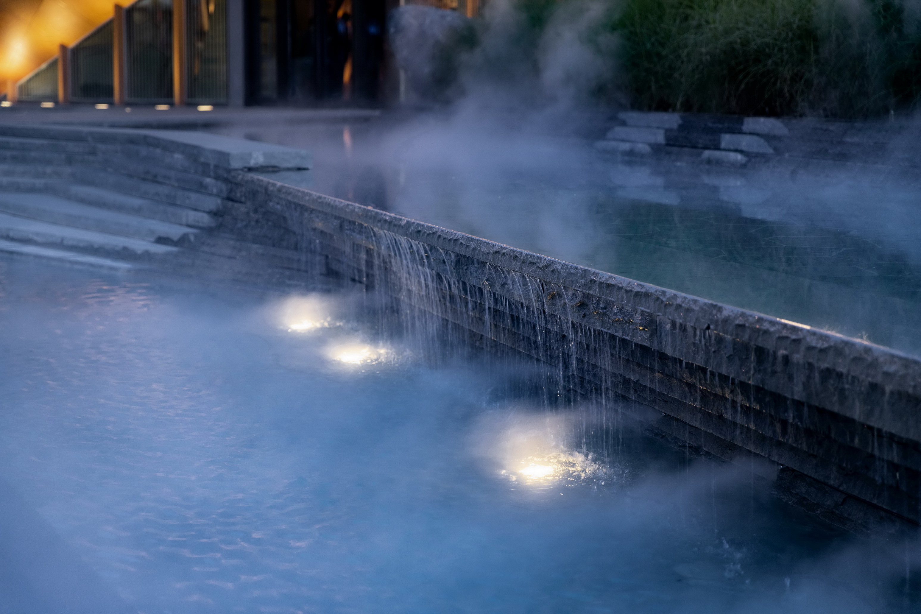 前场水景面积达1000平方米,且东西高差达2米,南北也有近1米的高差,为了更生动地模拟自然的山林效果,设计师进行了不同高度落差,进深的处理,其中有镜水面、悬挑水幕、跌水等参差错落、交融进退的水景空间处理。
