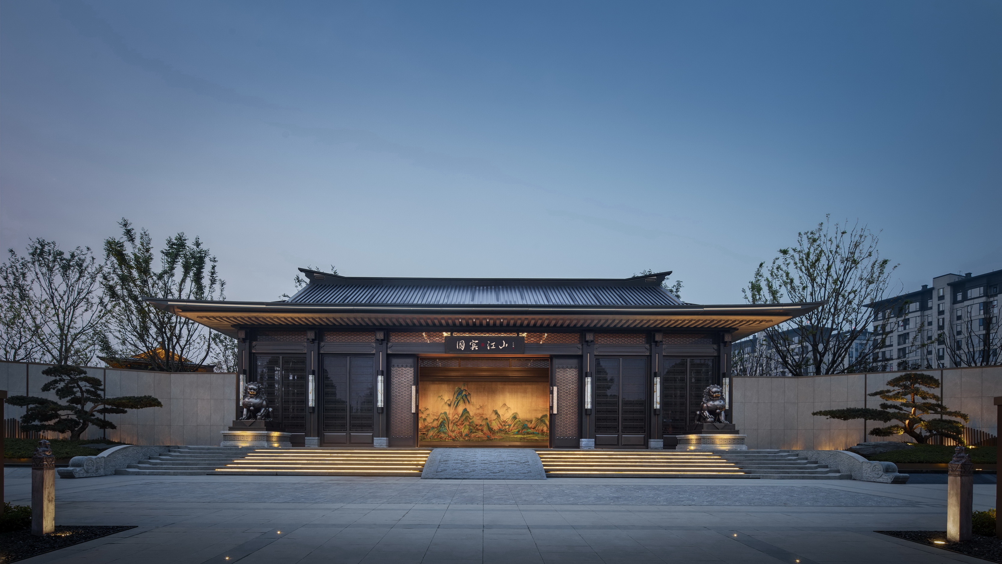 铜狮,祥云地雕与直面大门的《千里江山图》玉屏寓意丰富而祥瑞,其组合使得场面整体气势恢弘,拉开了国宾江山的序章。