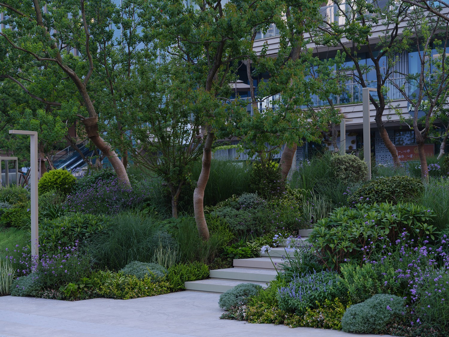 从规划、设计、选材、植栽,到现场水电、施工、结构、园建的整改再优化,每一张图纸、每一处种植池、每一块石材铺地、每一条街区,无不经过日夜兼程的推翻与重来、严密的推敲与描摹;从方案构思到施工落地,设计团队多次与甲方沟通,探讨和启发碰撞,反复检查与反复纠正保证“公园式街区”的最佳效果落地。作为空间设计师我们是创造者也是坚守者、捍卫者,我们要确保创造出来的景观生境为周围为当地带来可持续发展的现实意义,并与在地文化一同生长影响这片土地的人与生物,我们创造着景观这一媒介既与外在的客观环境交融,又与使用者的精神世界相通,一种创新性的社区生活将在细致的洞察与匠心精工下缔结新生。