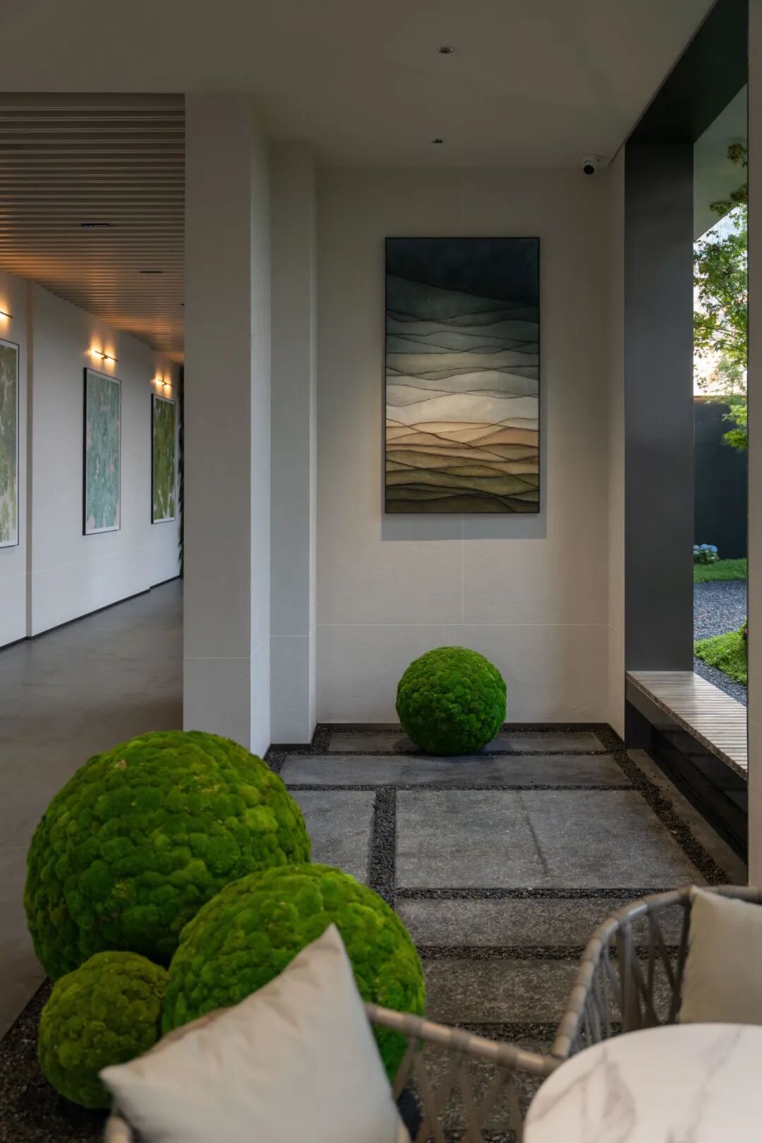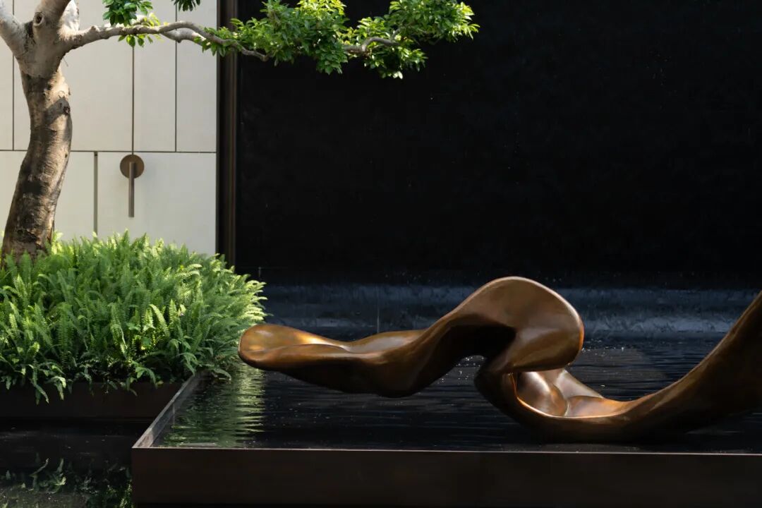连廊将入口一进空间与二进水院空间进行连接,同时也将水院形成对称镜像空间,富有动感且形态流畅的雕塑与植物的融合平衡了力量与柔美,为整体场景增添了几分自然的生气与和谐,营造一种肃穆和宁静的艺术氛围;