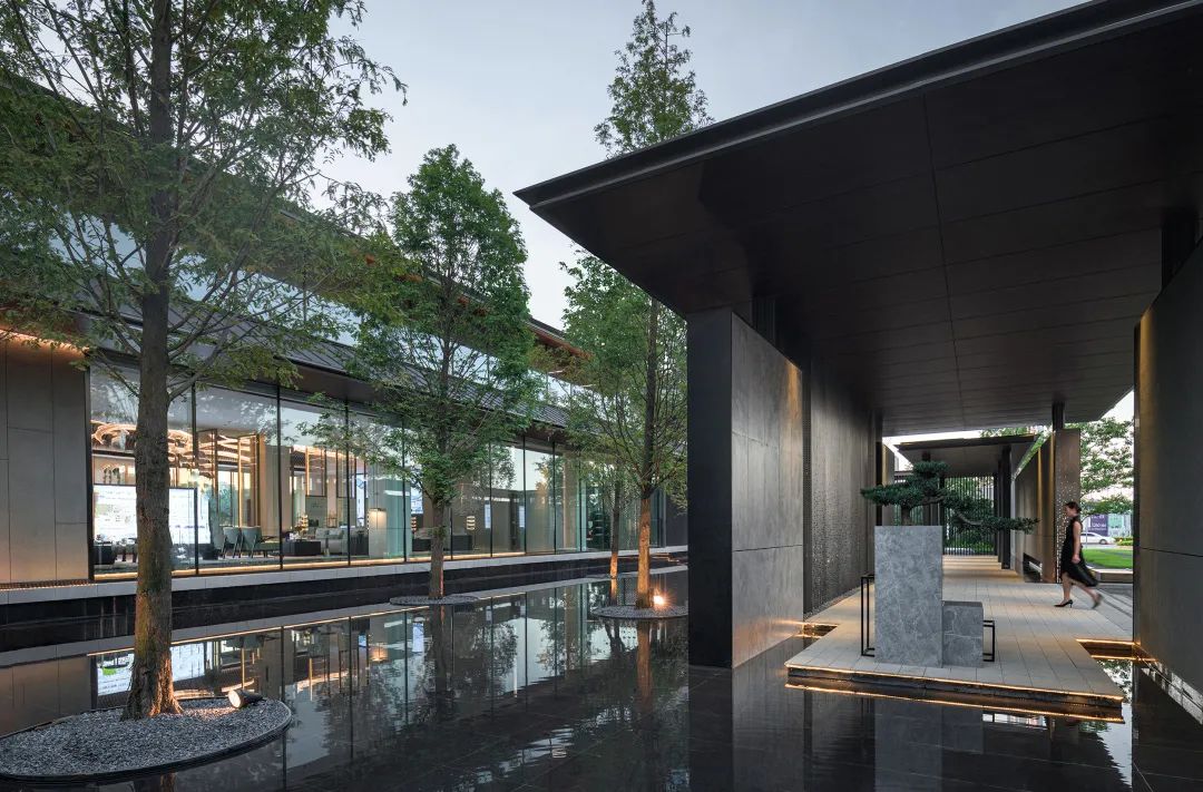 高低错落的连廊让空间变得丰富起来,引导通往一处静谧的所在。天井式的围合空间取意“水聚天心,四水归堂”,场地的竖向抬高,让此处与外界划分,形成独立的个体。