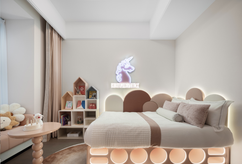粉色女儿房也充满父母对女儿的宠溺,舒适的床铺、宽敞的娱乐区域,让孩子在这个房间里能够尽情享受学习和游戏的乐趣。